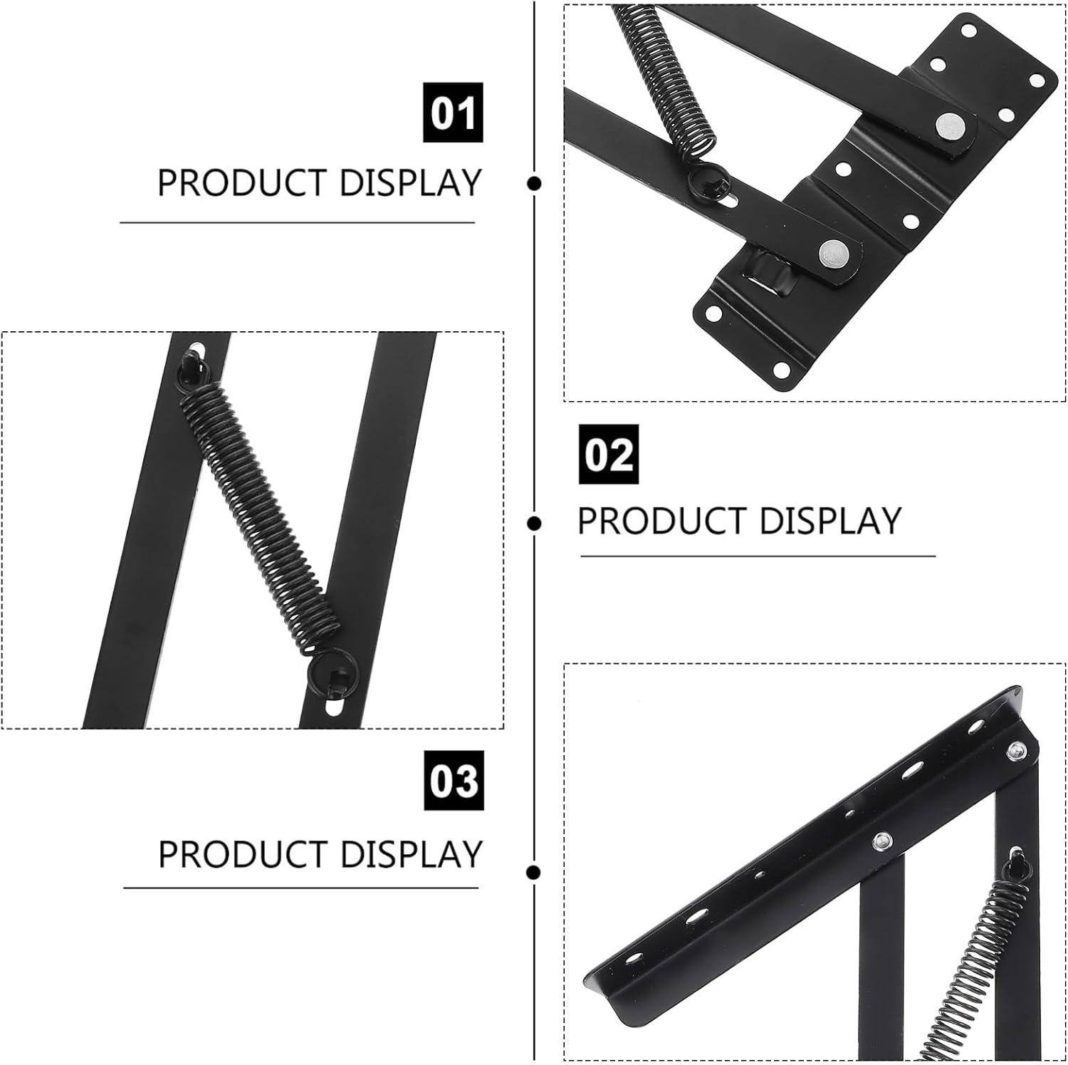 Package List 1 pair x spring hinges Characteristics - Color: Black. - Size: 23.50 x 22.00 x 5.00cm/ 9.24 x 8.65 x 1.97 inch. -Product Info:Lifting coffee table rack - Material: Iron. - It support slowly raised and folded, so easy to operate it. Easy to use and work great for home project Folding Hinge. - These desk mechanism hardwares combined with a sensory lock to make it more perfect Spring Hinges. - It's a good idea for coffee table, it can save space, smoothly, beautiful appearance Hydraulic Lift up Tops. - The coffee table lift tops hardwares suitable for functional coffee table, tea table, telescopic coffee table, mini wall cabinet, etc Heavy Duty Tops Lifting Frame. - The coffee table lift tops hardwares designed with a gas rod buffer, rise and drop is very slowly, convenient and safe Coffee Table Lifting Frames.Goods DescriptionFurniture Lifting Rack Folding lift up tops table is made of heavy duty iron material, anti-rust, durable and sturdy to use, not easy to bend and break.Spring Hinges This type of elevator allows you to transform your normal coffee table into a functional coffee table.Heavy Duty Tops Lifting Frame Easy to assemble, just attach the springs to the hinges, very easy to use