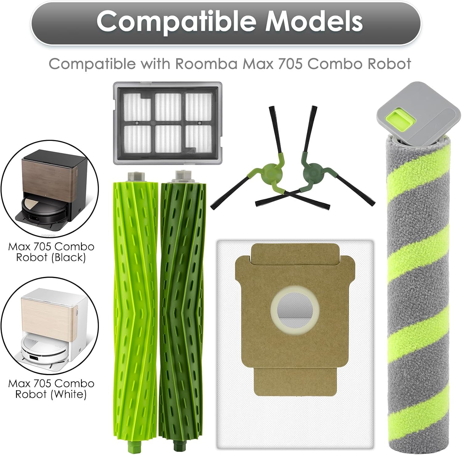 | Included Components | Accessories kit: 22 parts included: 4 roller brushes, 1 roller mop, 5 HEPA filters, 6 dust bags, 6 side brushes/ Perfectly compatible with iRobot Roomba Max 705 Combo robotic vacuum cleaner (Not for Max 705 Vac)/ Easy installation |