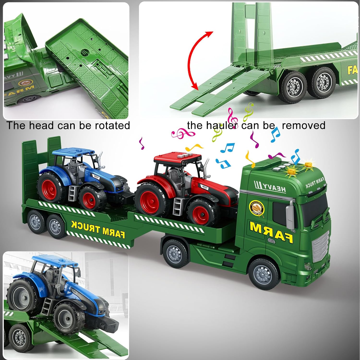 Product Description:25'' Large Friction Powered Farm Truck Toy Set for Kids with Lights & SoundsGet ready for massive fun with our extra-large 3-in-1 Farm Vehicle Play Set! This isn't just any truck toy for toddlers; it's a complete farm transportation adventure designed to spark creativity and provide endless entertainment for boys and girls aged 3-8 years old.Multi-Functional & Realistic PlayOur 25.59-inch large flatbed semi truck is a marvel of design. As a friction powered toy, it’s effortless for kids to play with. They can detach the truck cab, turn it to steer, and lower the ramp to load up the two included tractors. This interactive design helps children simulate real transportation scenarios, fostering imaginative storytelling and developmental skills.Interactive Lights and Fun SoundsPress the buttons to bring the farm to life! The simulated lights and sounds (including realistic engine noises and horns) make playtime incredibly engaging and immersive. This feature is expertly designed to be easy for 3 4 5 year old boys and girls to operate independently, enhancing their sensory experience and keeping them captivated for hours.Built to Last & Absolutely SafeWe prioritize your child's safety. This premium semi truck toy is constructed from durable, high-grade ABS plastic. It undergoes a rigorous smoothing process to ensure all edges are rounded and burr-free, guaranteeing it is completely safe for toddlers. Its robust design can withstand vigorous play, making it a long-lasting toy for your little one.The Ultimate Gift of Learning and FunMore than just a car toy, this set is a valuable educational tool. It encourages role-playing, improves fine motor skills, and develops problem-solving abilities. Presented in a stunning gift box, it is the top choice for a birthday gift, Christmas present, Children's Day gift, or holiday surprise for any young child.Fuel your kid's imagination with this fantastic farm truck boy toy today!