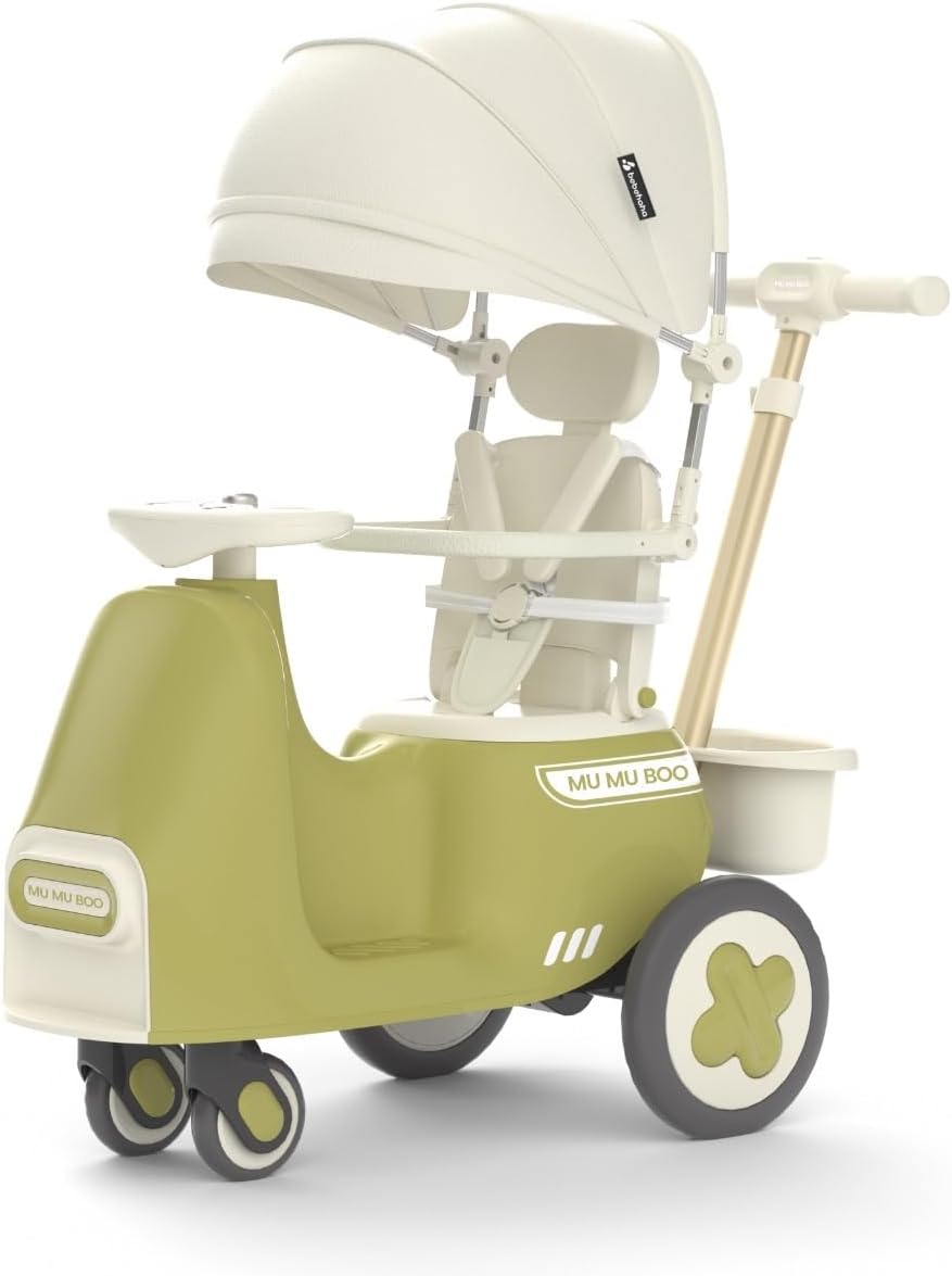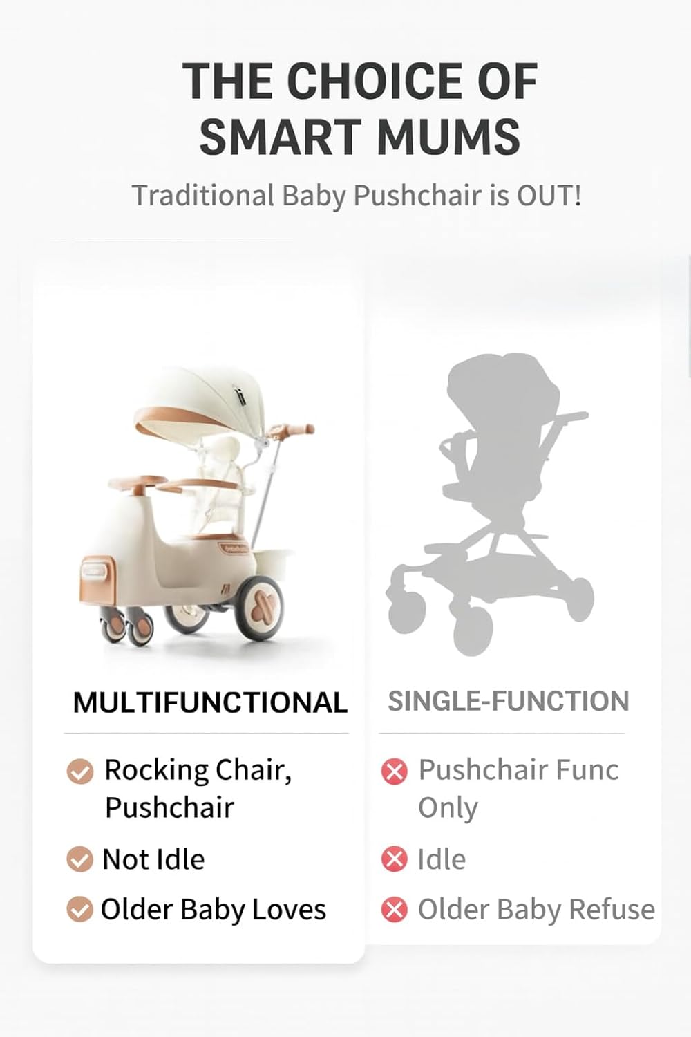 The MUMUBOO 3-in-1 Ride-On Car Stroller is an innovative solution that combines three functions in one: a stylish stroller, a fun ride-on car, and a soothing rocking seat. Unlike traditional products, this breakthrough design uses a patented rocking system that works naturally without batteries or charging – simply push, and it rocks automatically. With this calming motion, babies enjoy a gentle soothing ride, while parents stay in full control. Built with a secure 5-point harness, PU-wrapped guardrail, and anti-rollover structure, it ensures safety both indoors and outdoors. The sturdy silent wheels glide smoothly on different surfaces, while the removable sunshade (UPF 50+) provides protection for outdoor adventures. Perfect for modern parents who want more than just a stroller, the MUMUBOO Ride-On Car offers innovation, safety, and award-winning design – creating a premium riding and rocking experience for both boys and girls.