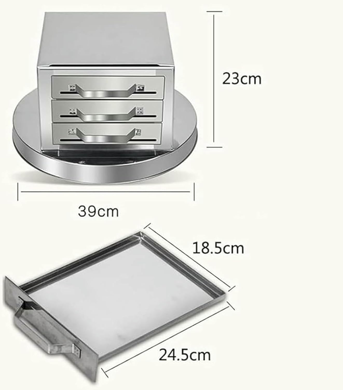 The rice roll machine features a thickened stainless steel plate for durability, a laser panel for precise control, and three spacious drawers for efficient organization. Specifications include a product name of Rice roll machine, made from thickened stainless steel material, with a pallet size of 245*185mm, overall product dimensions of 39*39*23cm, a silver color, and a weight of 7.2kg. The packaging includes one rice roll machine. Note that actual colors may vary slightly due to lighting and brightness differences, and there may be a 0-2cm error in measurements due to manual handling. If you encounter any issues during use, please contact us for support; we value feedback to improve our products.