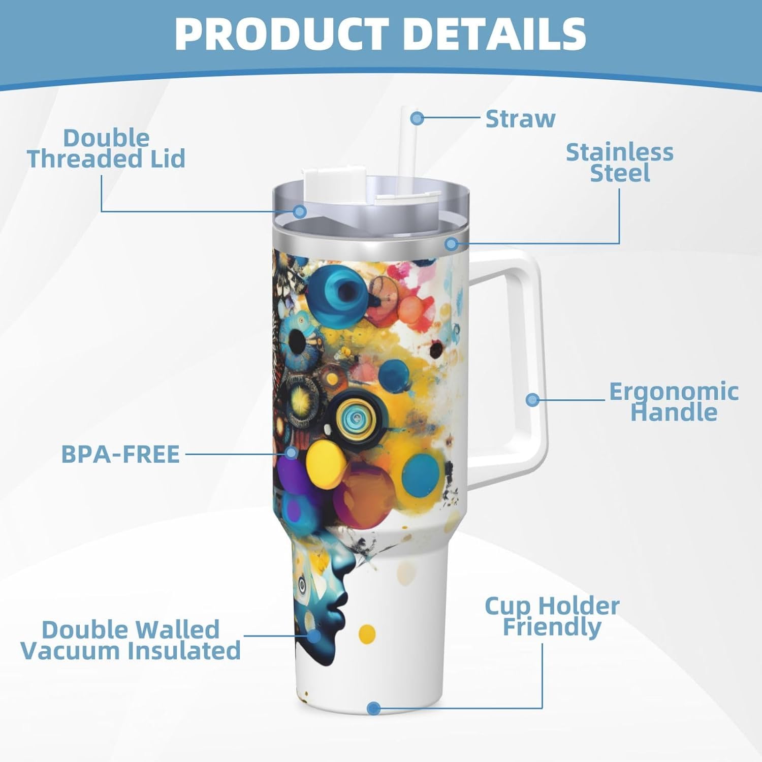 This Artificial Intelligence Brain Print Ice Bully Cup features a double layer stainless steel design that can be used for a long time without rusting. The lid has good sealing to prevent water from overflowing, and it is easy to unscrew for filling and cleaning. It can keep water, coffee, or drinks warm or cool for hours and is suitable for travel, camping, and driving.