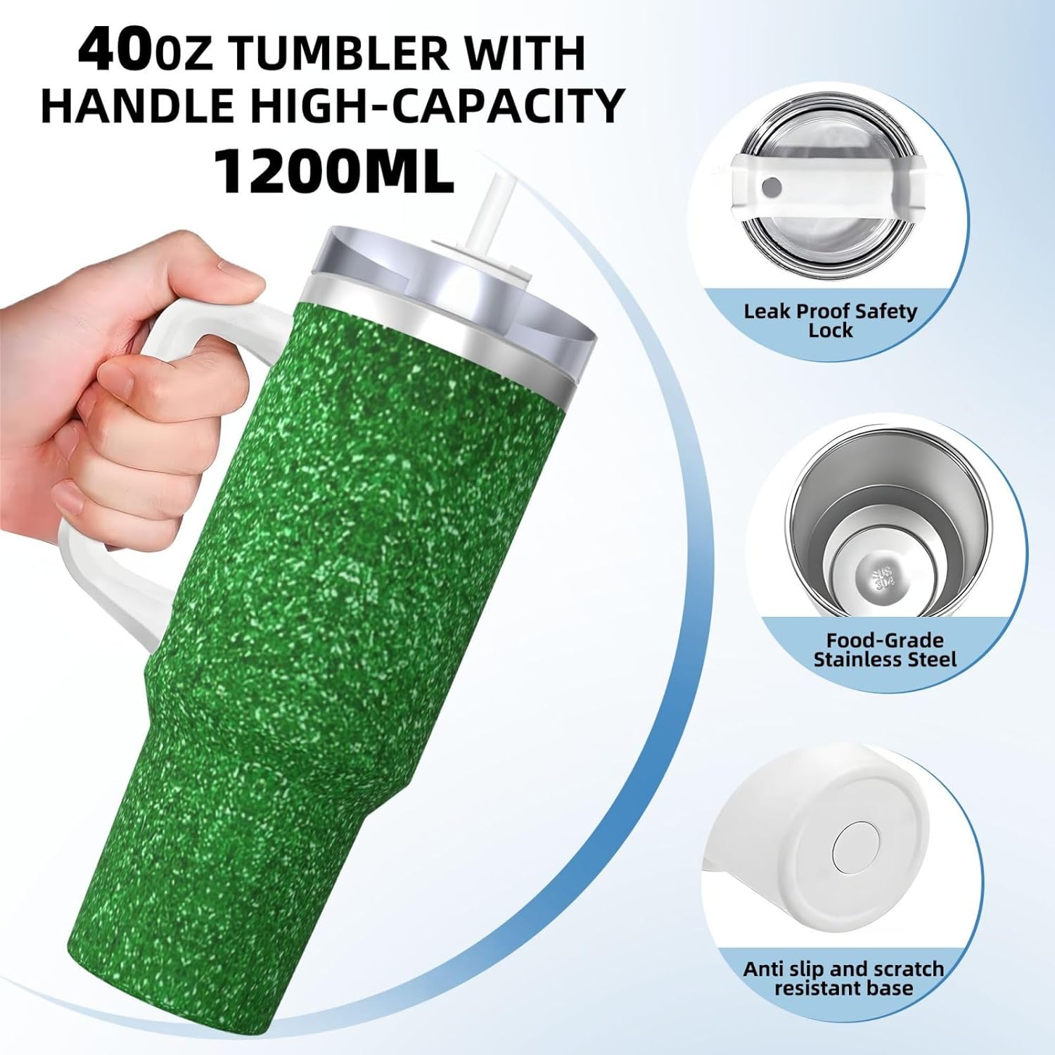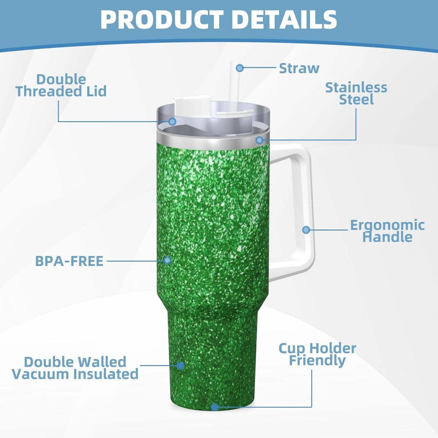 This Green Sequin Sparkle Print Ice Bully Cup features a double layer stainless steel design that can be used for a long time without rusting. The lid has good sealing to prevent water from overflowing, and it is easy to unscrew for filling and cleaning. It can keep water, coffee, or drinks warm or cool for hours and is suitable for travel, camping, and driving.