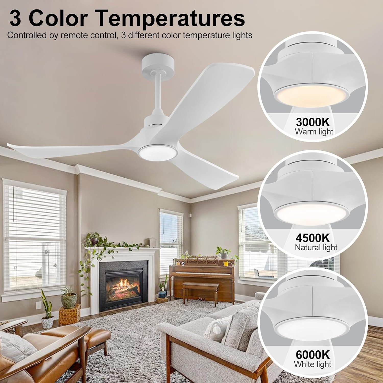 | Special Features | 1H/4H/8H Timer Fuction Modern Ceiling Fan with Light and Remote, 52 inch Ceiling Fan with 6 Speeds Remote Control, Ceiling Fan with Adjustable 3 Color Flicker Free LED Lights and Lighting Memory, Comes with 2 rods, contact us for FREE longer rods, DC Motor Ceiling fan has Forward and Reverse Function |