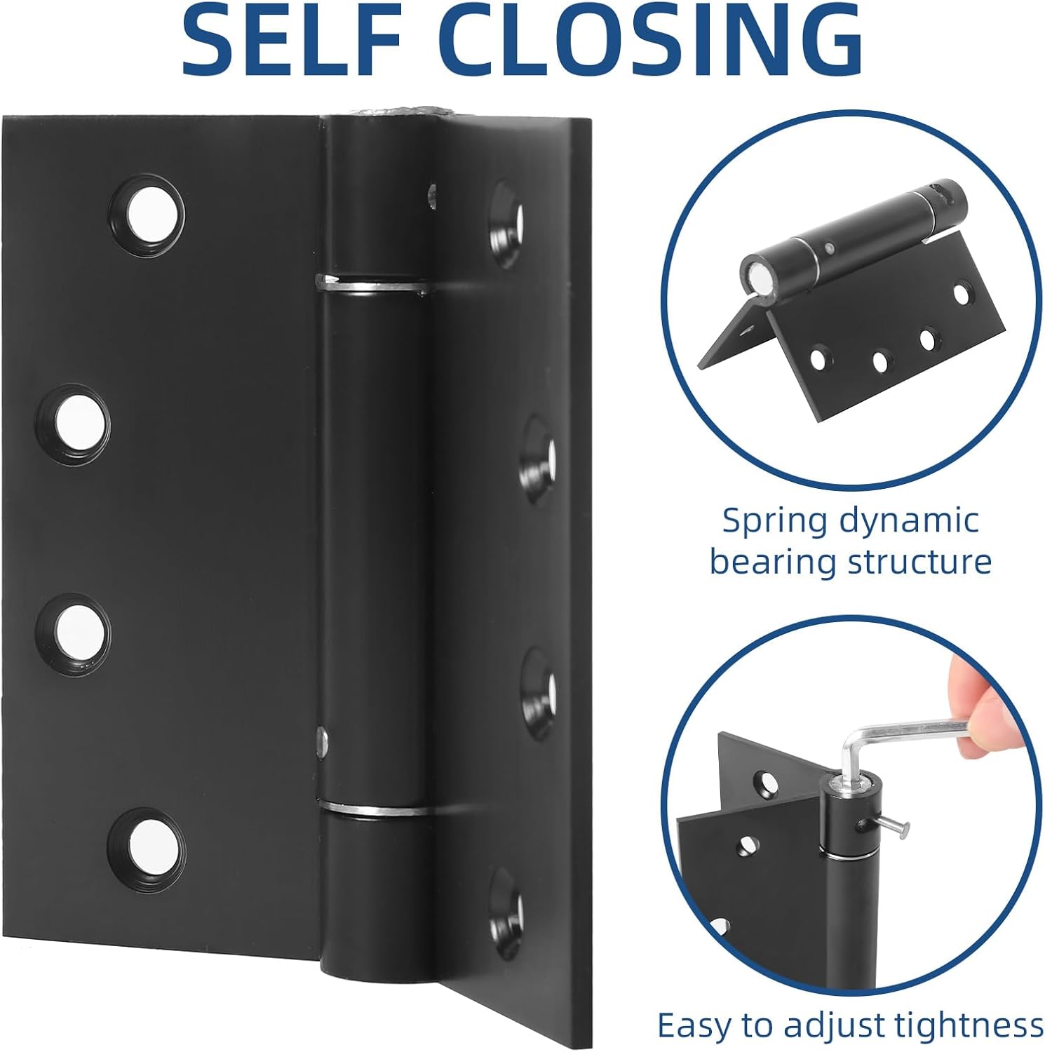 LITLANDSTAR Self Closing Spring Loaded Hinges are made of high-quality stainless steel with a matte black finish, which has a fine and smooth surface, offering a modern look while ensuring the security and stability for long-term use. Equipped with a built-in spring mechanism that ensures automatic door closing and extremely smooth operation, providing quiet open-door and close-door experiences. This spring loaded hinge is particularly practical for individuals who frequently forget to close the door. Specifications: Material: Stainless Steel Size: 4" (101.6mm) x 4" (101.6mm) Thickness: 3mm Application: Garage, Living Room, Bedroom, Bathroom, Kitchen, Basement, Office, Cabinet, Shed, Barn, Classroom, etc. Features: 1. Upgrade the thickness of hinge blades to 3mm, which makes it more sturdy and more load-bearing than similar hinges. 2. With Perfect surface treatment, these spring hinges will not rust and age even when used in extreme weather conditions. 3. All screw holes are countersunk, making the door hinges more beautiful-looking and safe. 4. Each box includes mounting screws and a tension adjustment tool, just need a screwdriver to upgrade your doors. Package Included: 6 x Matte Black Spring Loaded Hinge 6 x Pin 48 x Matching Screw 2 x Hex Wrench Warm Tips: Please check the position of the 8 holes carefully before installation.