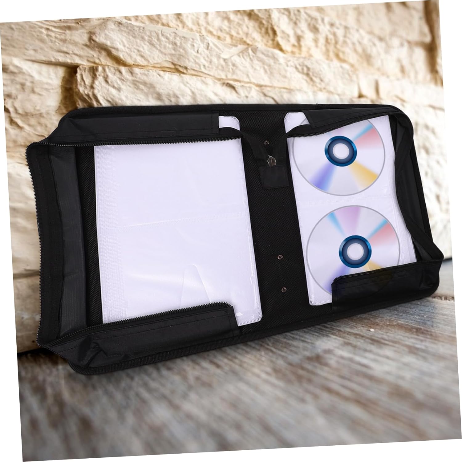 Package List 2 x CD discs storage bags Characteristics - Color: Black CDs PU Case. - Material: PU CDs Storage Case. - Capacity: 128pcs CDs CD Holder Pouch. - Size: About 29.50X16.50X9.80cm/11.59X6.48X3.85inch Disc Case. - Saves your storage space, can be numbered, holds CDs and liner notes in both sides easily Disc Storage Bag. - Protects disks , damp, scratches and corruption. and portable. Great someone special CDs Storage Bag. - inner pages won't scratch your CDs, and is wear-resistant, as well as can prevent shocks Large Capacity CDs Bag. - Sleek design easily fits into . Zipper closure is easy to insert and remove CD Holder Case. - Large capacity design can help you store and protect multiple CD discs CD Zipper Case.Goods InformationLarge Capacity CDs Bag The practical disc storage bag can be used both in the car and at home.CDs Storage Case The storage bag with large capacity design is convenient and practical.CD Holder Pouch If you want to buy a CDs storage bag, then you should not miss our product, this is a movie disc storage bag made of materials, which can serve US for a long time