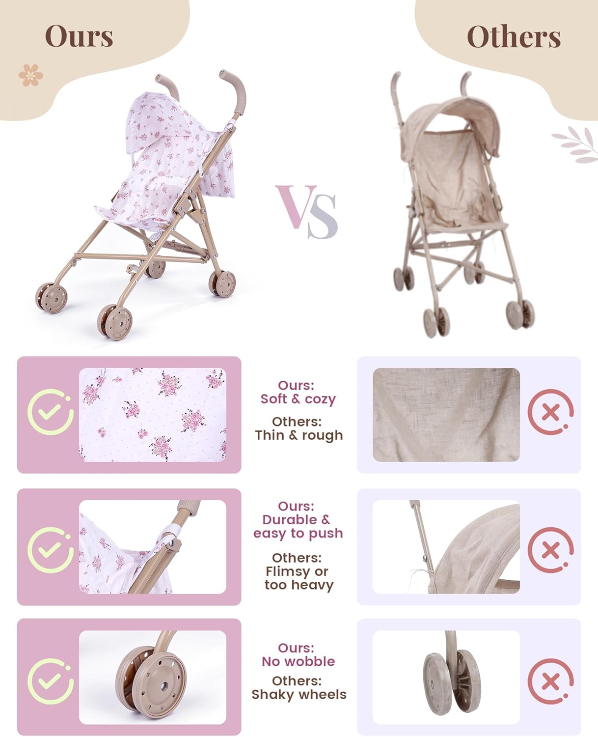 • 【Sturdy All-Terrain Wheels for Smooth Riding】 Strong, durable wheels ensure smooth gliding over any surface, indoors or outdoors, making it a perfect addition to any baby doll playset.