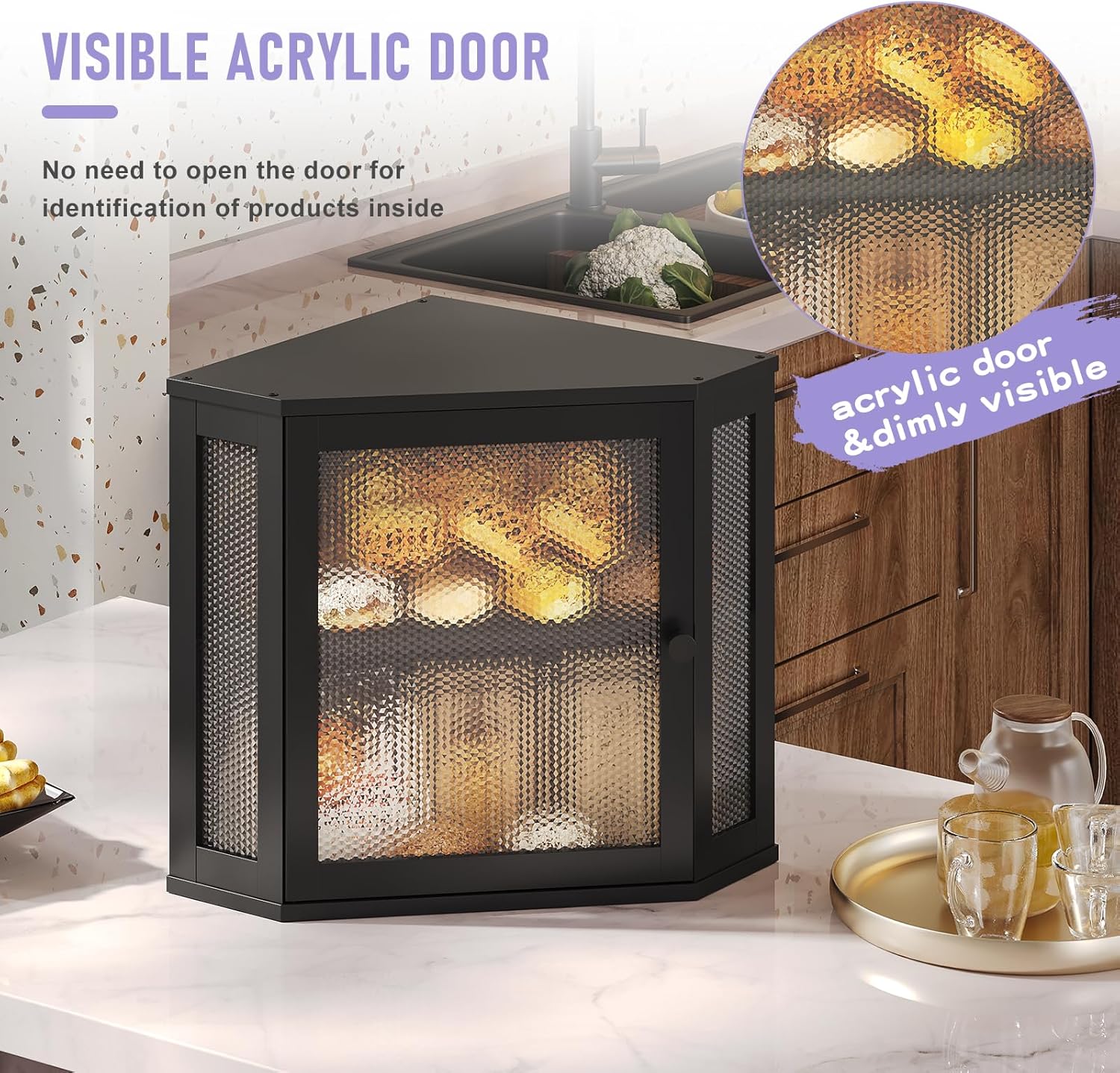 Elevate your kitchen storage with this stylish corner bread box designed for modern countertops. Featuring a distinctive wavy acrylic door panel that adds a touch of farmhouse charm, this spacious storage solution measures 15.0 x 8.0 x 6.0 inches, providing ample room for your favorite baked goods. The hinged lid with a window display allows you to easily see your bread without opening the container. With a generous capacity of 1320 cubic inches, this bread box keeps your baked items organized and accessible. The thoughtfully designed construction includes a hand-washable surface to maintain its pristine appearance. Perfect for storing various types of bread, rolls, and pastries, this countertop essential combines functionality with farmhouse aesthetics to complement your kitchen decor. Please note: This item requires hand washing and is not suitable for dishwasher or microwave use.