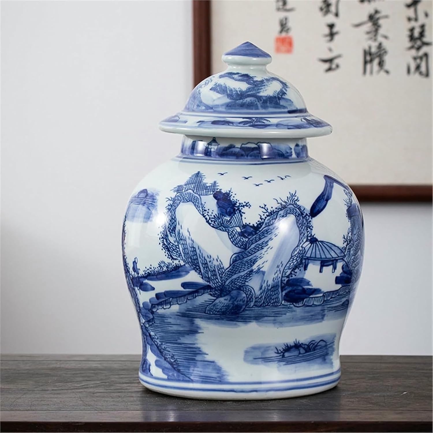 Blue and White Ginger Jars with Lid, Chinoiserie Porcelain, Porcelain Vases Decor for Living Room, Bedroom, Kitchen, HallwayMaterial: porcelainList: 1 x ginger jar (Note; other items are props)Use and maintenance1. Regularly clean the outer wall of the vase and the stains on the water2. The vase is fragile and avoid collision with hard objects.Note : 1.Regarding the size and color, due to manual measurement, there are some deviations in the size, please understand2.Color: Due to the phone, lighting and display, the color will be slightly different, but it will not affect the overall appearance of the product; I hope to understand.3.This product only contains the product itself, other items are shooting props, please understand,After receiving the goods, the actual product shall prevail.4.If you like our item, we will appreciate if you can share your experience with others. Your encouragement is our greatest motivation.