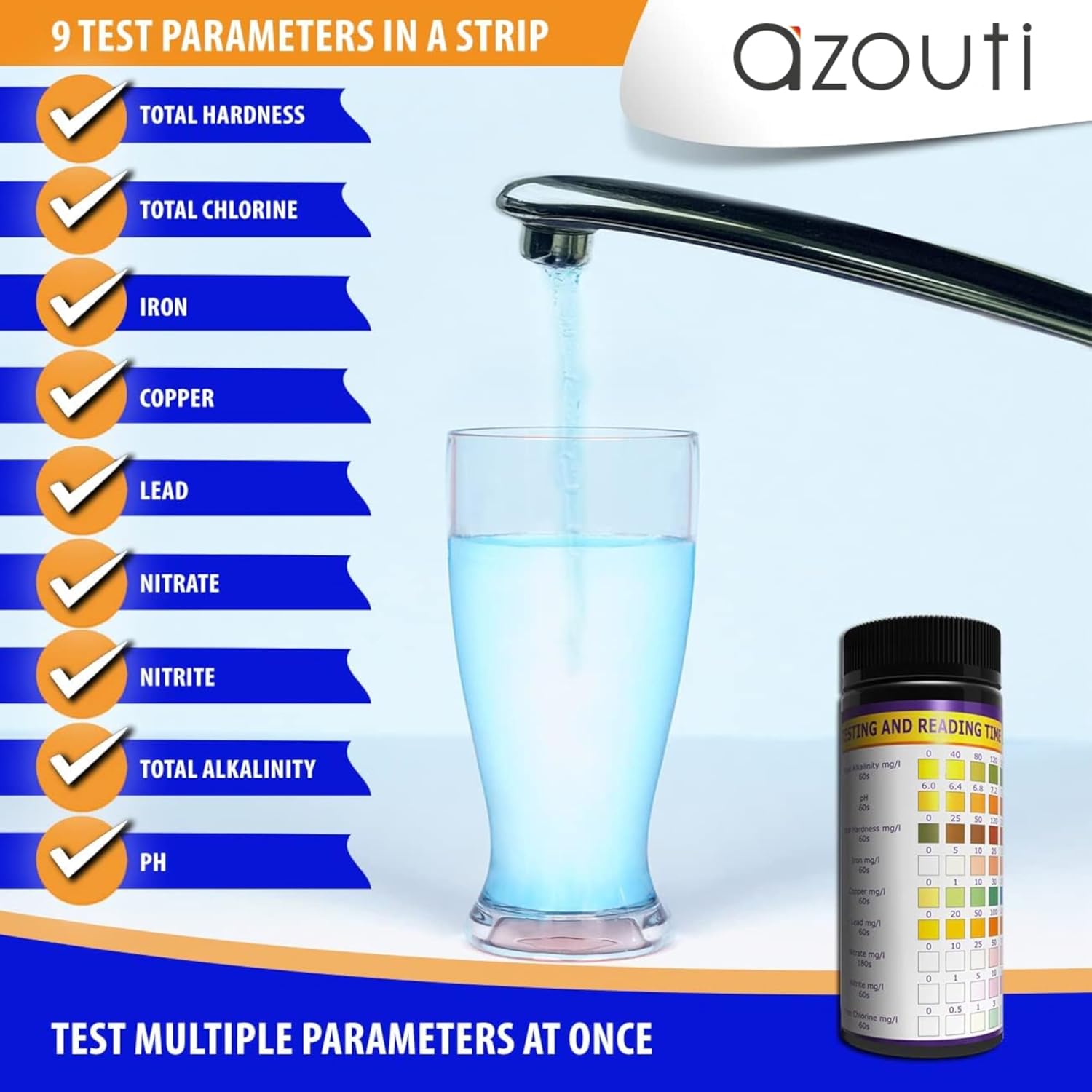 Use our high quality Drinking Water Test Strip to get 9 test results with one strip. Dip the strip to the water sample for 2 seconds, then tap the side of the strip on to a paper towel. Different parameters have different wait time for the result to manifest, it is best to wait 3 minutes and compare color of the test pad to the color chart. Here's a quick summary of the test in each strip. Total Alkalinity measures the water's ability to neutralize acids. Total Hardness is the measurement of mineral content in the water. Copper is a chemical element that may be found in water and is not good for the body. Nitrate is a colorless, odorless, and tasteless chemical found in water, however, too much of it is not advisable. pH will indicate if the water is acidic, neutral, or alkaline. Iron is important for the body and could be part of a dietary requirements, but too much of it is not advisable. Lead could be found in water and may result to health issues. Free Chlorine kills bacteria in the water but too much of it is not good for the body. Nitrite is also a colorless, odorless, and tasteless chemical but more reactive than Nitrite. Too much of it is dangerous to the health. Know your water by checking often! Packaging may be updated for better customer experience.