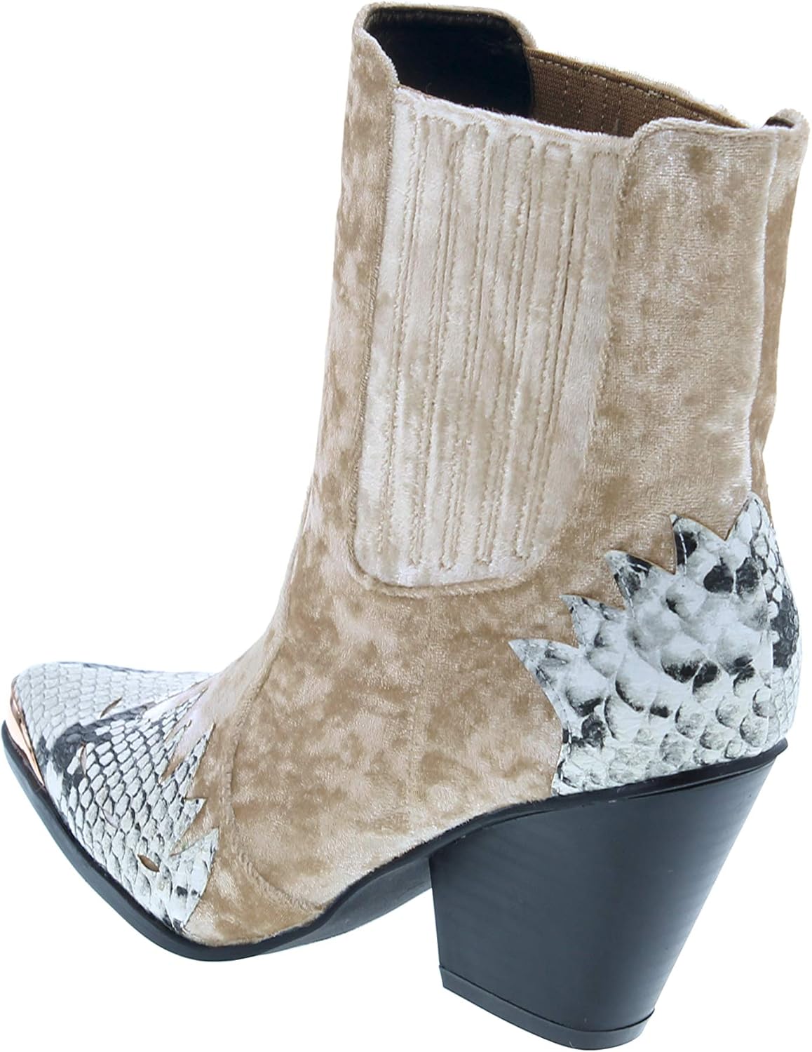 These velvet booties are made with a pointy toe, flame inspired accents, and ankle high rise. Also made with a chunky heel and easy to pull on design.
