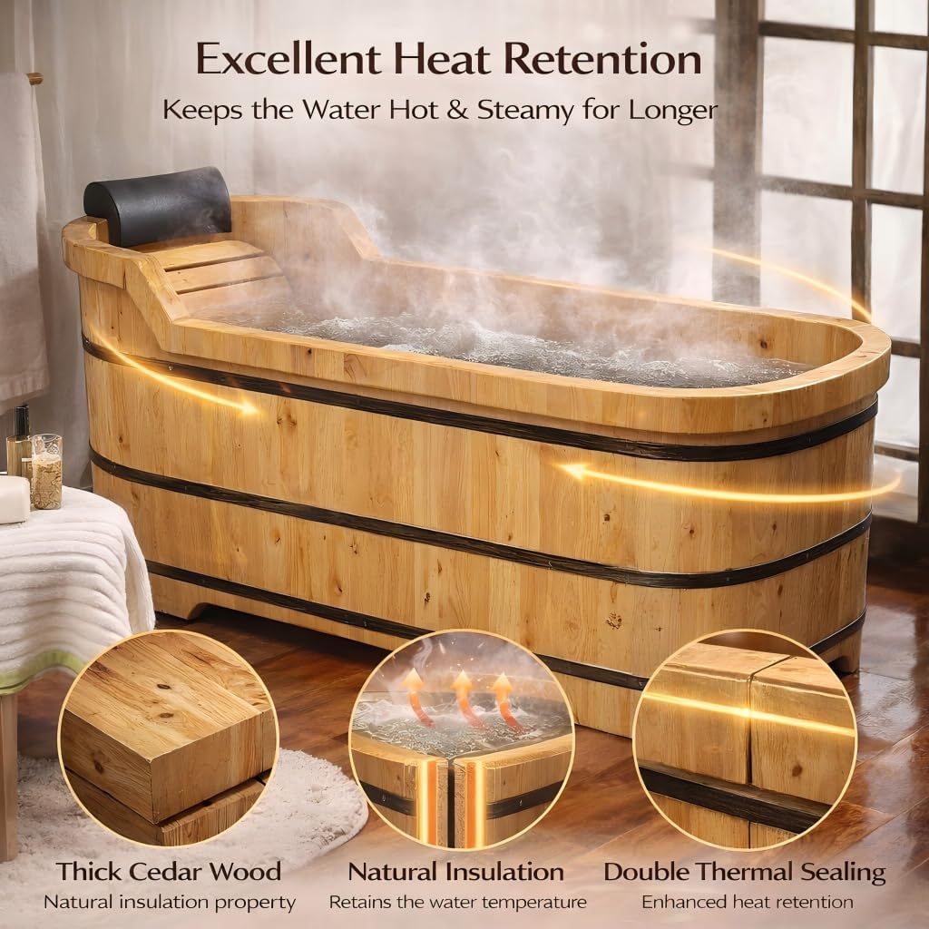 Experience a relaxing bathing environment with the OGOLOUG Cedar Wood Soaking Tub, a freestanding wooden bathtub designed for comfort and spacious soaking. This wooden spa bathtub features a square barrel design that provides more shoulder space compared with traditional oval wooden bathtubs. The design allows adults to enjoy a more comfortable soaking position while maintaining a compact exterior size. The soaking tub is available in seven length options ranging from 39 inches to 63 inches, allowing it to fit various bathroom layouts. The bathtub width is approximately 25.6 inches, with a raised head height of 29.5 inches and a foot height of 25.6 inches, creating a comfortable reclining bathing position. Crafted from cedar wood panels, this freestanding cedar wood bathtub showcases natural wood grain and a smooth interior surface. The wooden bathtub structure is reinforced with three galvanized steel bands and internal tension support, helping maintain the tub’s shape during regular use. For added comfort, the soaking tub includes: Soft headrest Adjustable backrest Inner seat Drain valve Extendable drain hose The flexible drain hose allows convenient connection to most floor drains without strict drain positioning requirements. This cedar wood soaking tub is suitable for home bathrooms, spa rooms, wellness spaces, and relaxation areas, bringing a comfortable soaking experience to your daily routine.