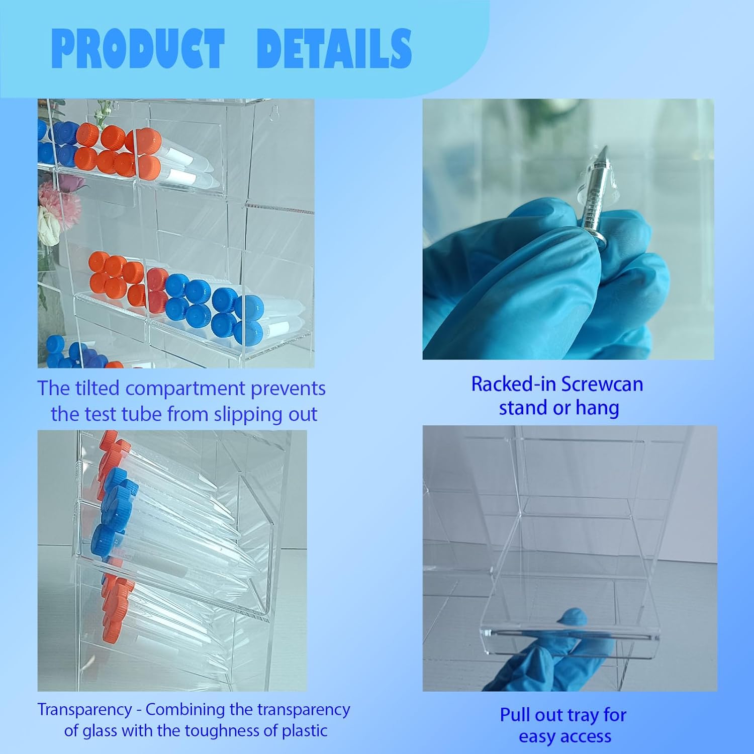 | Additional Features | Clear Acrylic Test Tube Rack,12" H x 7.9" W x 5.5" D,4 test tube rooms with 2 pull-out trays |