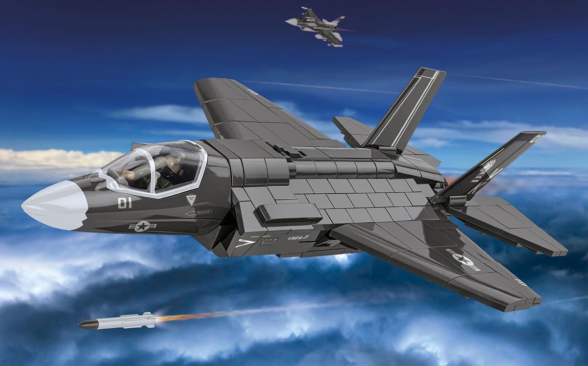 Build the F-35B LIGHTNING II kit and add one of the most advanced combat fighters to your collection in 1:48 scale.The F-35B is an American, single-seat, multi-role, fifth-generation fighter aircraft. It is a short takeoff and vertical landing (STOVL) aircraft, designed as a successor to the venerable Harrier.Build and add the first mass-produced supersonic aircraft with STOVL capabilities to your collection!F-35B - Marine Corps VariantThe F-35B is the successor to the AV-8B Harrier II aircraft in the US Marine Corps. The F-35B is a Marine Corps variant, characterized by short takeoff and vertical landing (STOVL) capability, allowing for Operating from smaller aircraft carriers as well as from field airfields, it is capable of carrying out close support, bombing, and air combat missions. It was developed as part of the international Joint Strike Fighter program. Designed by a consortium of Lockheed Martin, Northrop Grumman, and BAE Systems, it has become a symbol of technological and combat superiority on the modern battlefield.Sophisticated onboard computers make it a true technological jewel. It also features an integrated helmet that provides the pilot with 360-degree visibility.The aircraft is characterized by low observability in flight, the ability to fly at supersonic speeds, and advanced reconnaissance and electronic warfare systems—including detection, tracking, targeting, and jamming.Weapons That Spread FearThe F-35B can carry weapons both in internal bays (to maintain stealth) and on external pylons (to increase firepower). The COBI model is equipped with the AGM-88G AARGM-ER anti-ship missile. Long-range radar systems designed to destroy surface targets, ground-based fixed and mobile radar stations.The F-35B is a truly multi-role aircraft – capable of air combat, bombing, reconnaissance, and electronic jamming – all within a single mission.Now you have the chance to build your own version of this fighter and add it to your collection!Why choose the F-35B LIGHTNING II set?• Product under the original Lockheed Martin license – This model was created under the original license of the American manufacturer, guaranteeing a faithful reproduction of the legendary aircraft.• 1:48 scale – The model has been reproduced in a scale that perfectly fits into the world of other COBI sets. This allows you to freely expand your collection with additional aircraft, and the whole thing will look cohesive and professional on a shelf, desk, or display case.• 614 detailed pieces – Each block has been precisely designed to faithfully capture the character and appearance of the real F-35B aircraft.• Rubber tires and movable elements - The set not only looks great but also offers full mobility. The plane features rotating rubber tires, an opening cockpit, movable controls, and an opening bomb bay.• Pilot Figure - The set includes a pilot figure in a recreated American uniform with original markings, equipped with a helmet and oxygen mask with a hose. The pilot can be seated in the opening cockpit or placed next to the plane model.• High-quality prints - The model does not contain any stickers - all markings, symbols, and details are printed directly onto the bricks. This ensures the set's appearance remains durable, clear, and abrasion-resistant - even after many hours of intense play.• Especially for Collectors - The set includes a specially designed base with a brick stud for attractive display, and an elegant plaque featuring the set name, scale, and the American flag.• Easy to Build - Thanks to the intuitive, step-by-step instructions, building the model is a pure pleasure for both beginners and advanced builders. Designers and more experienced designers alike.• Wide selection: Check out other vehicles, not just from the ARMED FORCES series, from COBI and create your own collection of incredible machines!The F-35B LIGHTNING II combines modern technology, operational flexibility, and immense firepower. Thanks to its unique vertical landing and short takeoff capabilities it can operate from locations inaccessible to other fighters such as the decks of smaller aircraft carriers or makeshift landing sites close to the front line.This is a future-proof tool, designed for the most demanding missions in the most demanding conditions. Its versatility, powerful armament, and ability to operate in heavily defended environments make it one of the pillars of modern air forces.Recreate this icon of modern military aviation in brick form – build the F-35B and experience the power of the world's most advanced fighter.