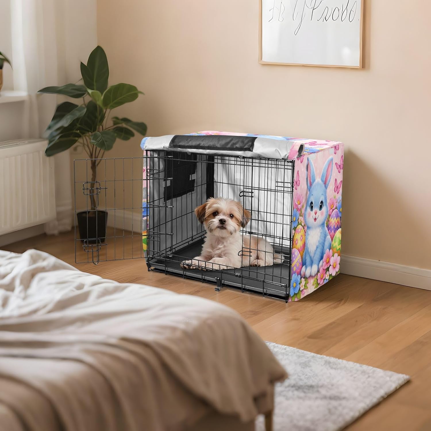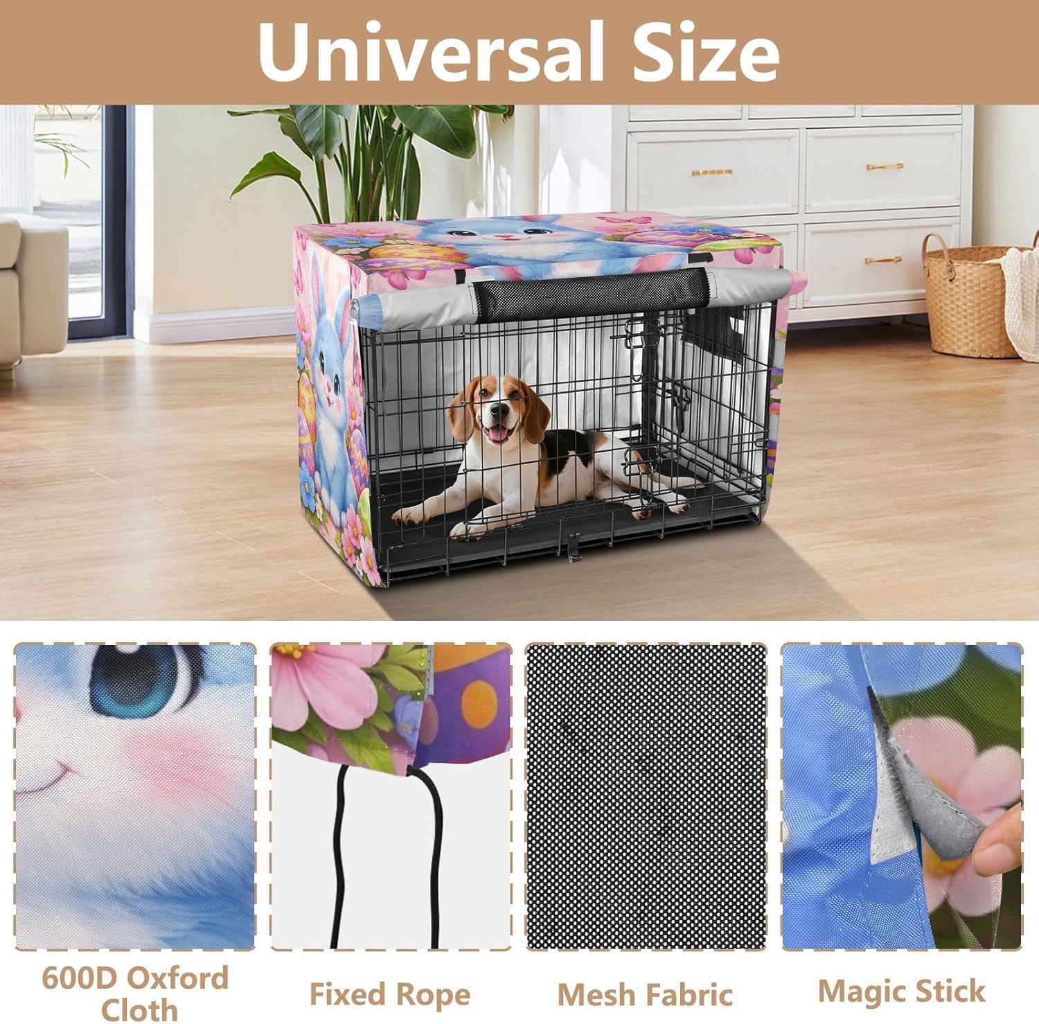 High-Quality Material – Crafted from 600D silver-coated oxford fabric, this travel dog crate cover offers weather-resistant protection against rain, wind, and sunlight. It helps to keep your pet safe and comfortable, ensuring the crate remains in good condition.Fast and Easy Setup – The fastening system allows for a quick and straightforward installation process, making it ideal for pet owners who need an efficient solution for their dog crate cover.Breathable Design – With mesh windows on all sides, this travel pet crate cover ensures consistent airflow, which helps keep your dog cool and comfortable while inside the crate. The breathable mesh also provides privacy and reduces stress.Sturdy and Wind-Resistant – Four tie-down straps securely fasten the cover to the crate, ensuring it remains stable even in windy conditions. This feature prevents the cover from being blown off or moved out of place.Convenient for Travel and Home – This versatile indoor dog crate cover is designed for both home and travel use, providing a reliable solution for your pet's needs. Whether you're indoors or on the move, it offers excellent protection for your dog’s crate.