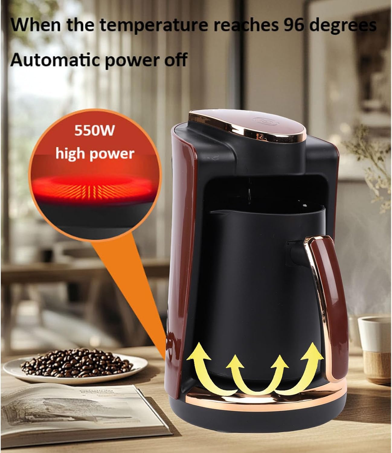1. High Power and Quick Heating: With 550W of high power, the Turkish coffee maker heats quickly, offering an easy to use and safe experience for brewing coffee. 2. Excellent for Rich Flavor: Designed for an ideal slow cooking experience, the machine enhances the richness of Turkish coffee, bringing out the of flavor. 3. Single Cup Capacity: Featuring a 250ML capacity, the coffee maker meets your consumption needs, allowing you to enjoy a wonderfully brewed cup of coffee anytime. 4. Reliable Plastic Material: Constructed from premium plastic, the electric Turkish coffee machine boasts a sturdy structure that prevents damage for dependable use. 5. Multiple Applications: Compact enough for easy carrying, the Turkish coffee maker is ideal for home, office, and travel use, making it a versatile coffee brewing companion. Specification: Item Type: Turkish Coffee Maker Material: Plastic Weight: Approx. 958.00g/33.79oz Product Size: Approx. 23.5x14cm/9.25x5.51in packing list: 1 x Turkish Coffee Maker 1 x Coffee Cup 1 x Spoon 1 x English Manual Notice: Do not allow children to touch the appliance.