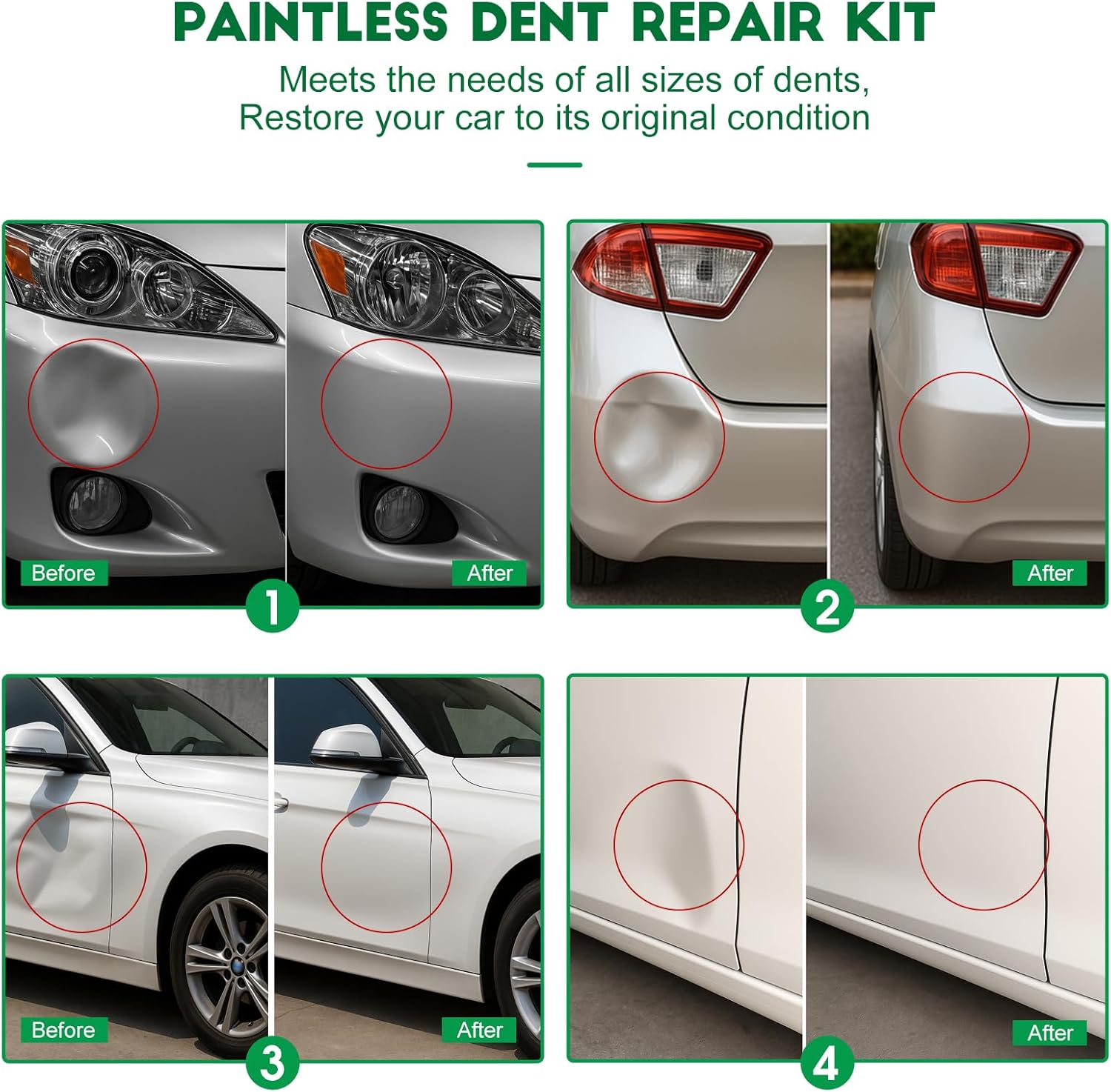 PROFESSIONALDesign:Golden Dent Lifter add to the adjustment function. Just adjust the space between the two legs of the dent lifter according to the size of the dent ,adjust the length of the centra bar according to the depth of the dent.PROTECTIVEOriginal Paint: All of size Glue Puller Tabs have a new design on the face,allows for maximum surface area without sacrificing the ability to remove the glue after use,the original paint will be protected in the greatest degreeWide Range of Applications :It is suitable for the dent of all kinds of flat metal ,such as the surface of automobile metal plate and the washing machine's metal plate.Durability Material :Industry-specific High strength aluminum, clean with alcohol before use and after repair and design allows for perfect positioning and superior adherent extractor.USING GUIDE:How to use the dent repair kit?(Suit for dent&ding and home DIY repair)Step 1: Clean the dent surface with a clean wet cloth.Step 2: Put the glue sticks into the glue gun,connect and open the power switch to preheat for 3-5 minutes.Step 3: According the car dent size to choose a suitable glue puller tab, generally the size of tab should be smaller than the dent.Step 4: Apply enough glue to the selected puller tabs, place the pull tab in the center of the dent immediately and press lightly for a while until the label sticks.(Cooling time depending on the temperature of environment, it should be longer in summer and slightly shorter in winter,usually need 5-10 minutes.The cooling time should be less than 10 minutes.)Step 5: After the glue cools down, align the hole in the center of the dent removal tool with the firmly adhered gasket, adjust the height and width of the dent remover (rotate the button to adjust the height and find the perfect position for the dent puller), and then use the puller to pull up the dent.Step 6: Repeat the above steps until the dent is eliminated.Step 7: After removing the car dent, use 95% alcohol(not included in the kit) or special glue remover(not included in the kit) to clean the residual glue which on the car body with a plastic shovel.NOTICE:Do not use this dent removal kit under the following conditions:Cracks have been appeared on the body paint;The body paints is not the original paint, peeled off or damaged;These dent puller tools are mainly used for repairing various dents on the metal surface, cannot use for the plastic surface.The spacer should be attached to the bottom of the depression, not to the wall of the depression, otherwise it will be easy to be unglued. The puller tab is a plastic spacer, which has no suction.;The spacer can not tilt pull, otherwise it will be easily unglued.If the dent is large, do not stick the spacer directly in the middle of the dent, but from the concave edge to the middle of the operation.