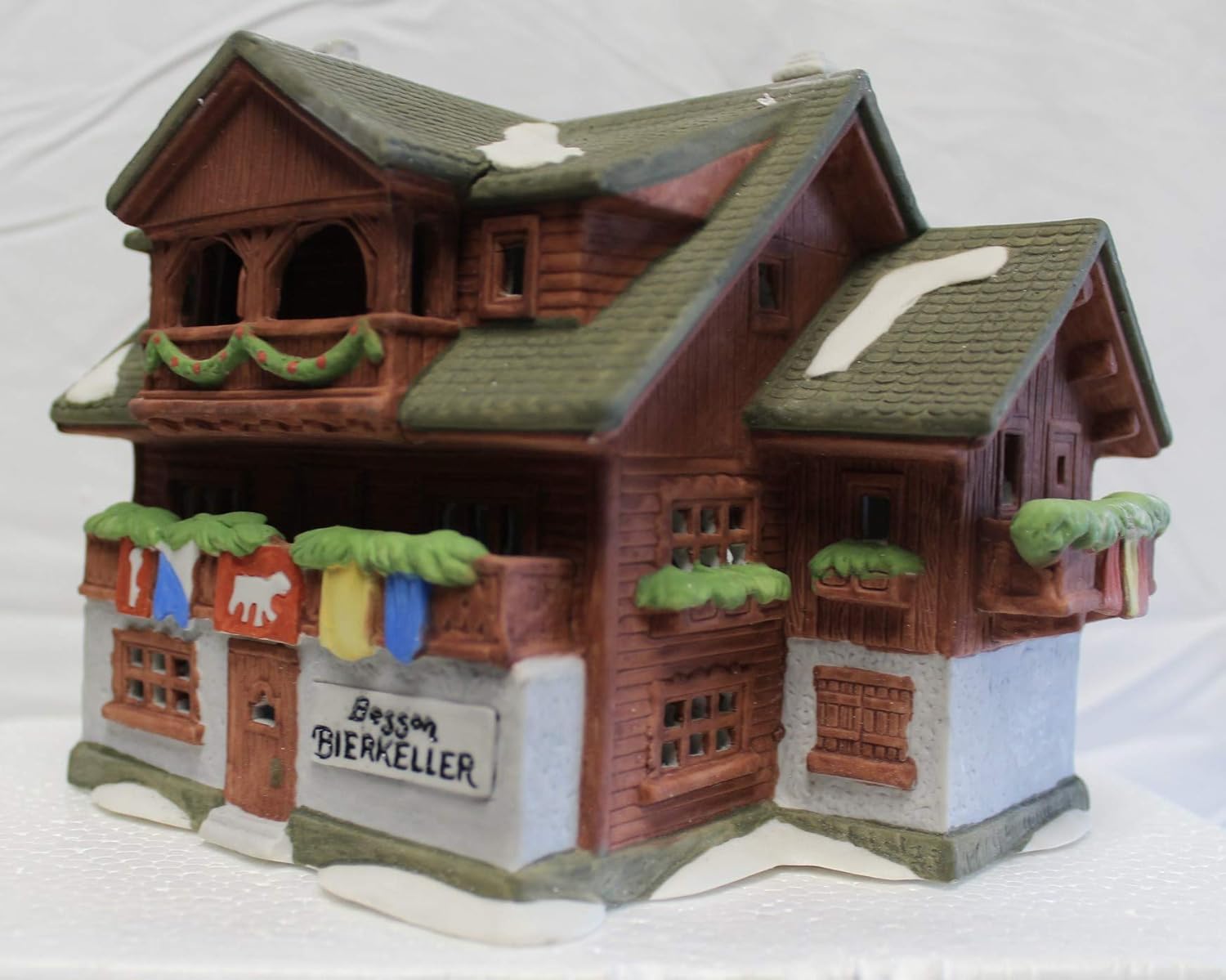 Window boxes on second story are hung with colorful banners. The third-story rustic timbered enclosed balcony has a garland decoration.