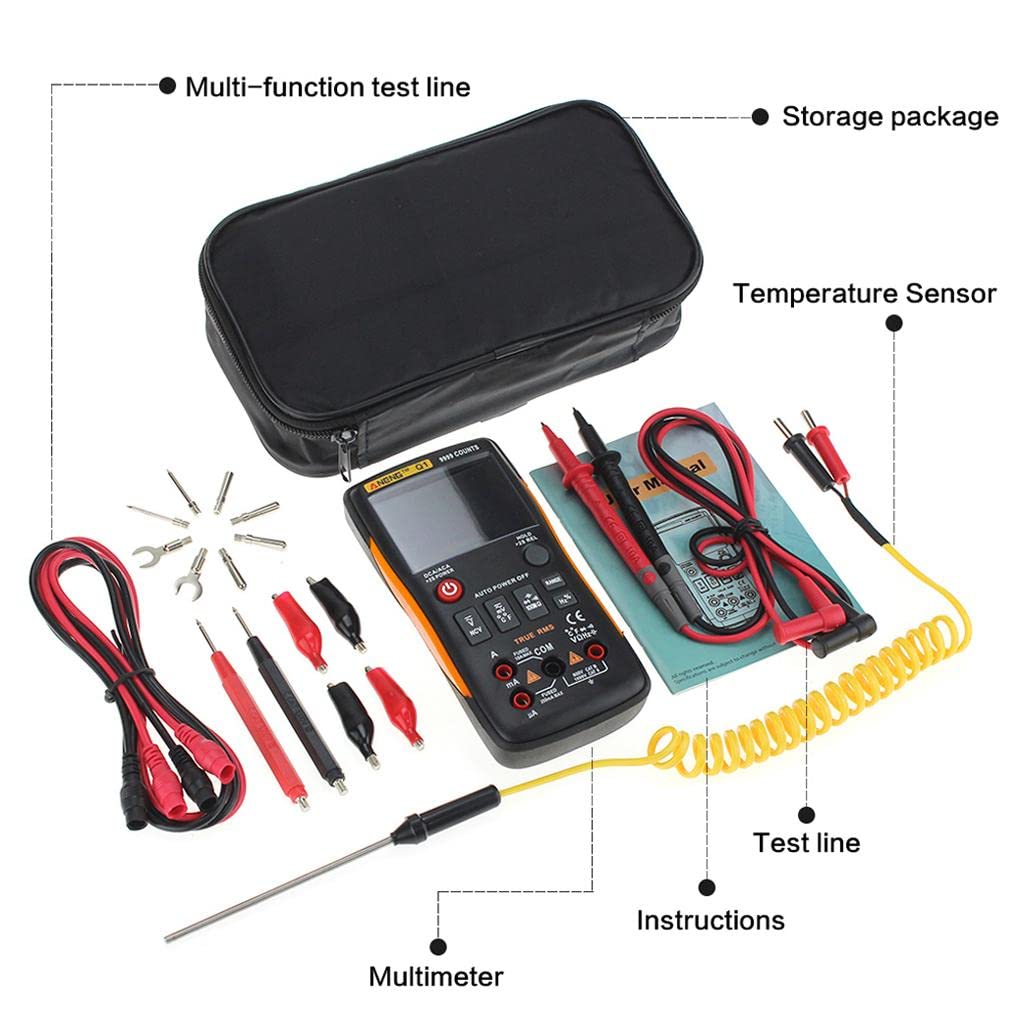 Description: - Model Number: Q1 - Storage Condition: -20~60 - Storage Humidity: 80%RH - DIY Supplies: Electrical - Operating Mode: Auto/Manual Ranging - Measuring Inductance Range: no - Measuring Temperature Range: -20~1000 C/-4F-1832F - Measuring Capacitance Range: 9.99nF/99.99nF/999.9nF/9.99uF/99.99uF/999.9uF/9.999MF - Measuring Voltage Range: 999.9mV/9.999V/99.99V/999.9V - Measuring Current Range:999.9uA/99.99uA/999.9mA/10A - Measuring Resistance Range: 99.99/999.9/9.999k/99.99k/999.9K/9.999M/99.99M Ohm - Frequency: 99.99Hz/999.9Hz/9.999KHz/99.99KHz/999.9KHz/5MHz - Display Type: Digital Display - Diode Test: Yes - Continuity: Yes - Duty Cycle: 1%-99% - Rate: 3 times per secondSpecification: - Material: electronic components - Size: approx. 45 x 73 x 30mm/1.8 x 2.9 x 1.2inch - Screen Size: 5 x 43mm/2.3 x 1.7inchPackage Includes:1 Piece Multimeter 1 Piece Test lead+temperature sensor1Piece User Manual1 Piece Storage Bag16 Pieces Test ProbeNote:Do NOT exceed the maximum value indicated in the Specification.Do NOT input voltage at the Current Mode, the Resistance Mode, the Diode Mode, the Continuity Mode, or the Temperature Mode.Do NOT use the product when the batteries or the battery cover is not placed properly.Turn off the product and remove the test leads from the test points before changing batteries or fuses.Do not input voltage exceeds 36V DC or 25V AC when you are at the setting of measuring current.