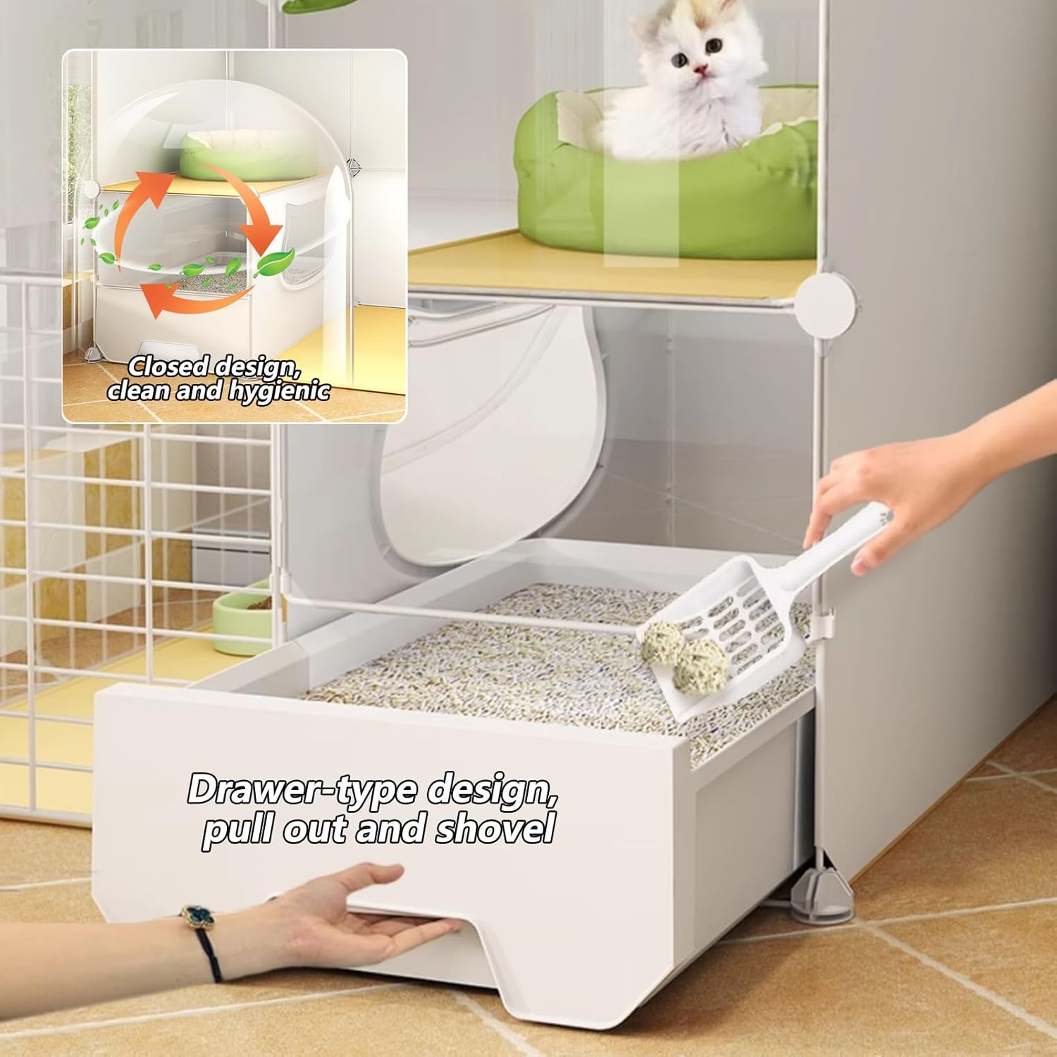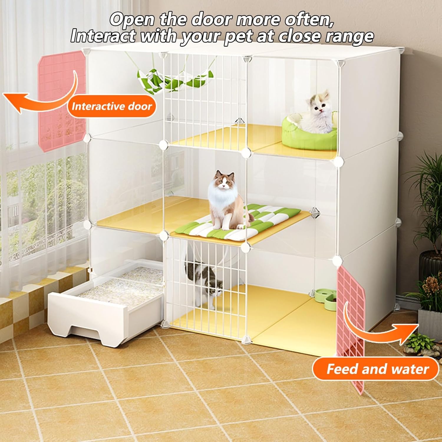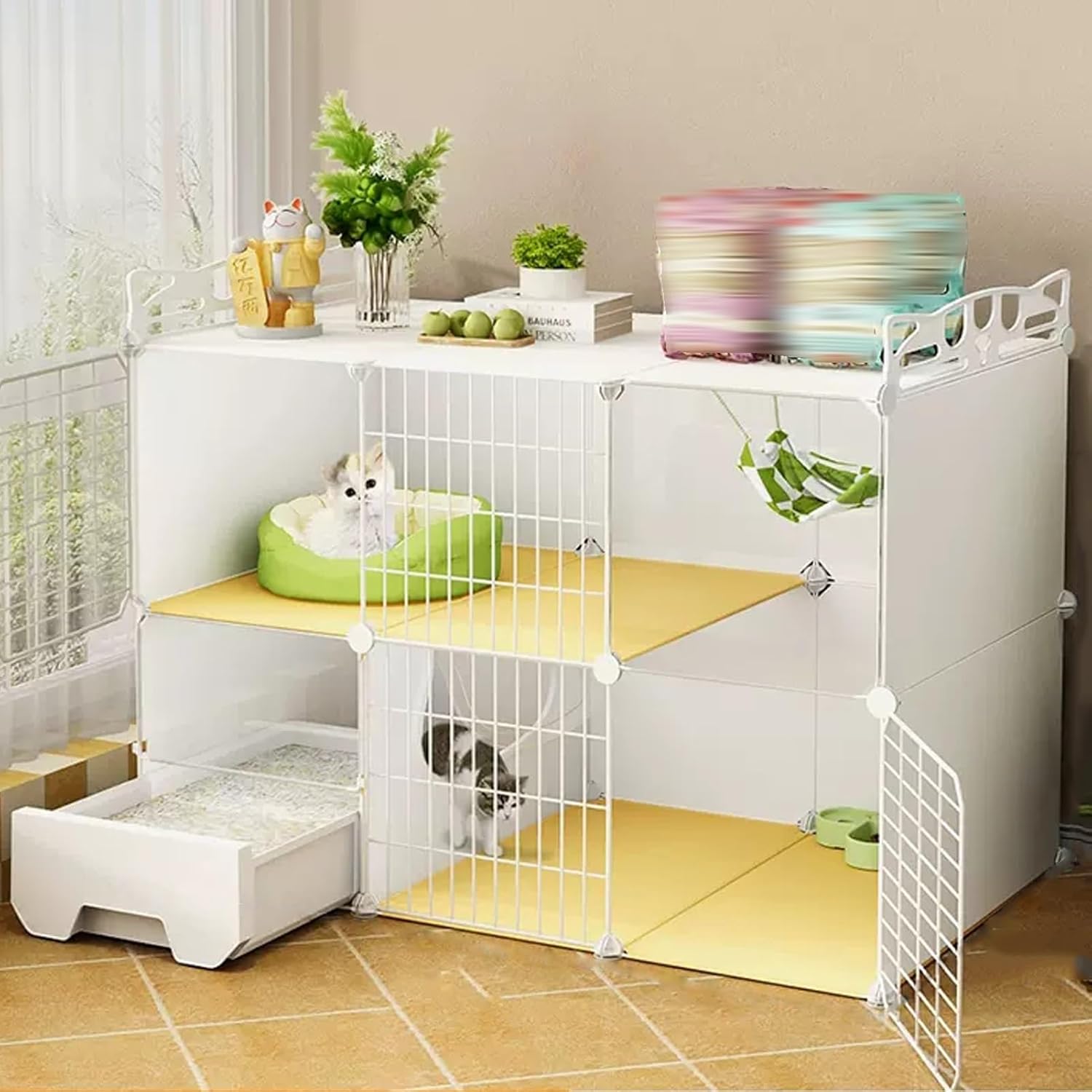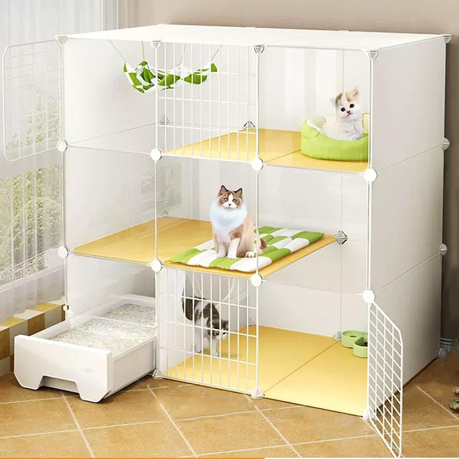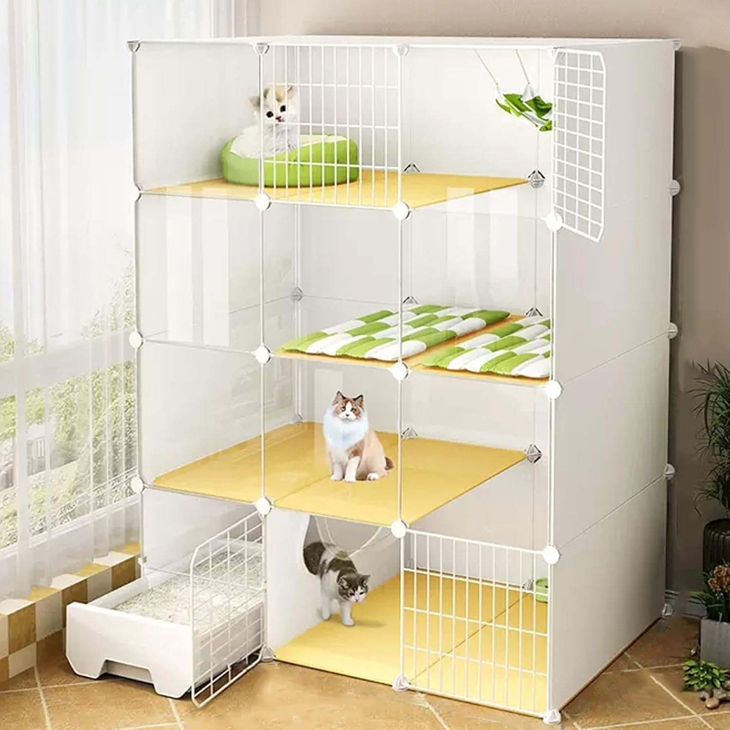 Metal Wire Folding Rabbit Cage:The spacious indoor cat cage offers your feline friend an ideal environment filled with natural light, warmth, and air circulation. Its modern design ensures it seamlessly fits into any room without overwhelming the space. Explore our diverse range of cat cages available in various styles and configurations to suit your specific needs. The versatile metal panels can be easily combined to create different shapes, sizes, and heights, making it the perfect choice for multi-cat households or single companions. **Key Features:** - **Material:** Durable iron mesh and high-quality resin ensure longevity and safety for your pet. - **Color:** Elegant white finish complements any decor. - **Target Species:** Designed specifically for cats, providing a comfortable and secure environment. - **Tiers Available:** Choose from 2, 3, or 4 tiers to maximize space for play and rest. - **Assembly:** Easy to assemble with clear instructions. - **Size Options:** Available in various dimensions (e.g., 29.5" x 15.4" x 28.7" up to 43.7" x 19.4" x 58") to fit your space perfectly. - **Capacity:** Accommodates 1 to 3 cats, ensuring everyone has a cozy spot. **Package Includes:** - 1 Cat Cage - Assembly Package A/B/C **Important Notes:** 1. Actual product colors may vary slightly due to monitor settings. 2. Size may have a variance of 1-3 cm due to manual measurement. 3. Cat supplies shown in images are for display purposes only and are not included. Create a safe and stylish haven for your cats with our indoor cage, where they can relax, play, and enjoy their surroundings!