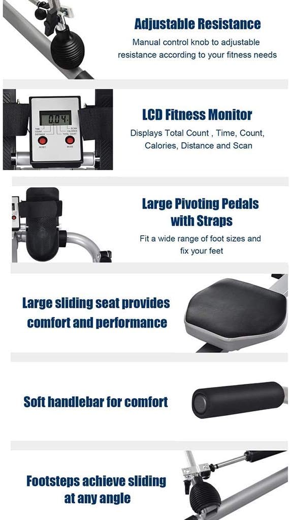 Description: The rowing machine has a good effect on muscle strengthening of the legs, waist, upper limbs, chest and back. With each stroke, the upper limbs, lower limbs, waist and abdomen, and back will complete a complete contraction and extension in the process, which can achieve a full body muscle aerobic exercise effect. Especially for people with a lot of fat on the waist, abdomen and upper arms, rowing machine exercises will bring you unexpected body shaping effects. Specification: Material: main e: steel pipe, cushion: leather + sponge Color: black+silver Size: 108x84x19cm Weight limit: 120kg Net weight: 13.5kg Package includes: 1 x Rowing machine 1 x English manual