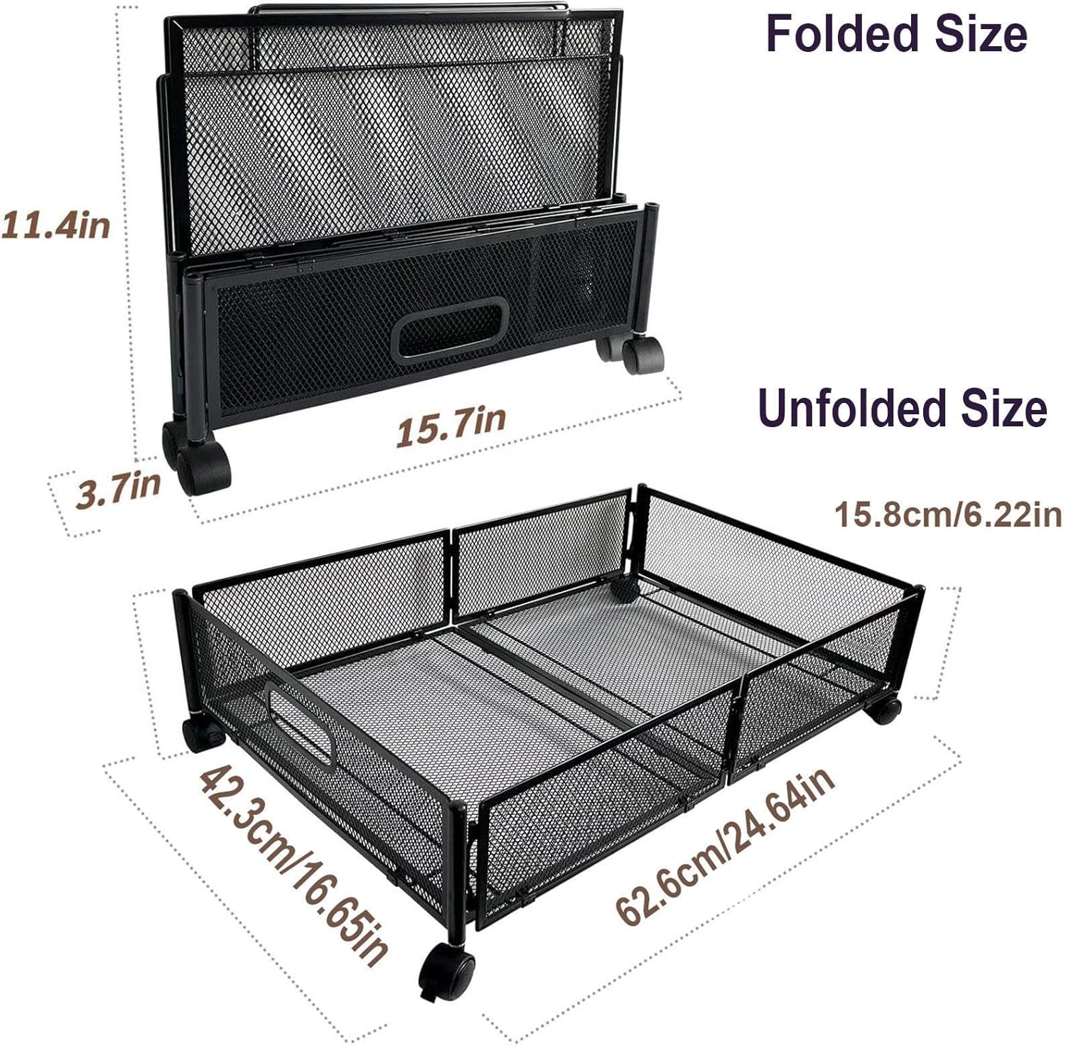 Product Description:Under the Bed Storage Containers with WheelsSay goodbye to the clutter and mess in your bedroom and hello to a neat and organized space. This under bed storage container is an excellent way to create extra space for your belongings without sacrificing the room's aesthetics. ▪Visible Mesh Design▪Quick Assembly▪Robust Steel Construction▪Versatile StorageProduct material: carbon steelSize: 62.6*42.3*15.8cm/24.64*16.65*6.22inchesPackage Included:2x Under Bed Shoe Storage with WheelsFeature of product:Suitable for use in attics, basements, closets, closets, bedrooms, cribs, under cribs and dormitories,Protect and store seasonal and everyday items, holiday decorations and keepsakes.Please note:The dimensions are all measured manually, there may be slight errors, which will not affect normal use.Its large size allows you to store multiple items such as clothes, shoes, bedding, and more. You can now utilize the previously unused space under your bed effectively.