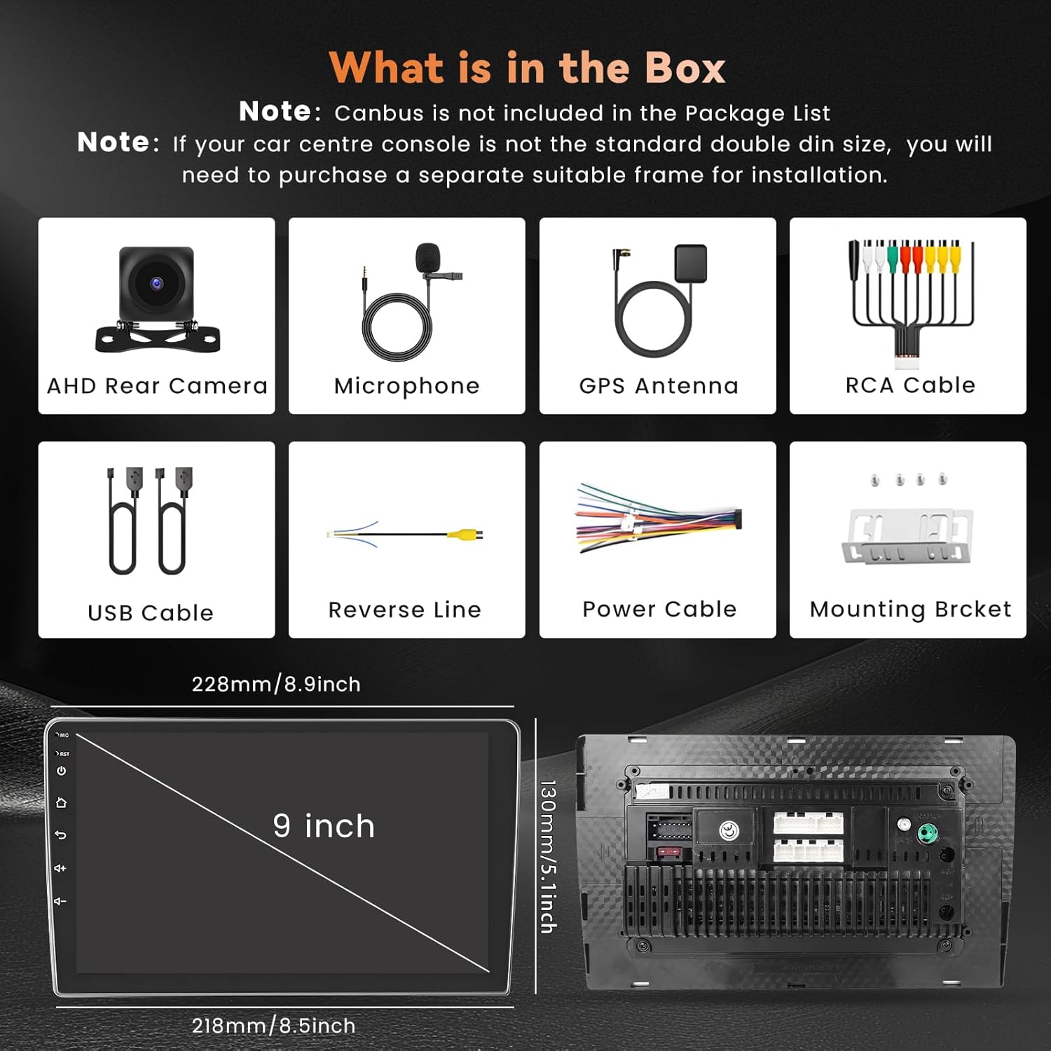 | BuiltIn Media | Android Car Stereo, Microphone, Backup Camera, Power Cable, GPS Antenna, Rear Camera lnput Cable, Mounting Bracket, Instruction manual, RCA Cable, USB Cable, Screw |
