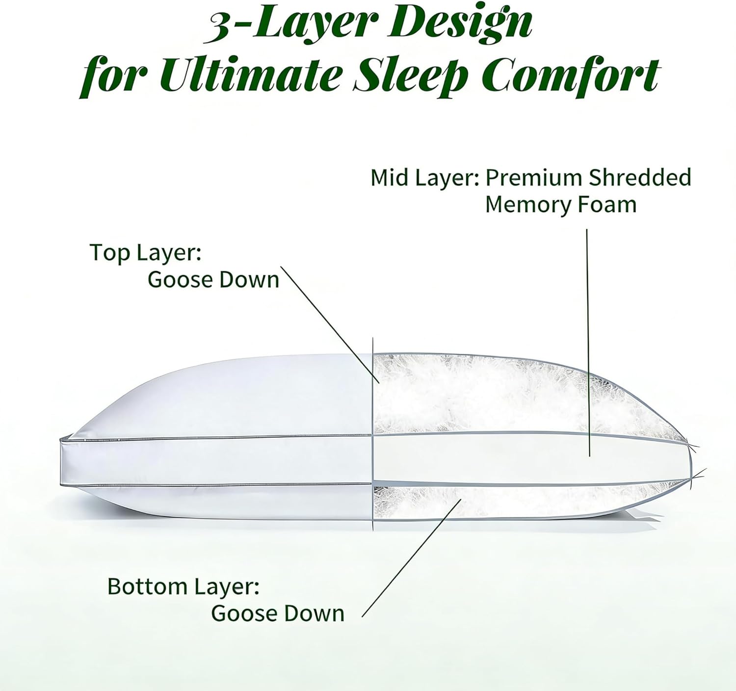 • 【Luxe 3-Zone Design: The "Sweet Spot" Between Marshmallow Soft & Orthopedic Support】Forget flat or overly firm bed pillows. Our premium goose feather pillow features an intelligent 3-layer construction that outsmarts ordinary pillows. The ultra-fluffy top layer mimics that iconic hotel pillows softness you crave, while the core—infused with resilient feather pillows and premium fibers—delivers targeted cervical spine support. Whether you're a side sleeper or back sleeper, you get the gentle cradle without sinking too low. It's the ultimate neck pillow for sleeping for anyone upgrading their bedroom decor or seeking that elusive "hotel-at-home" feel