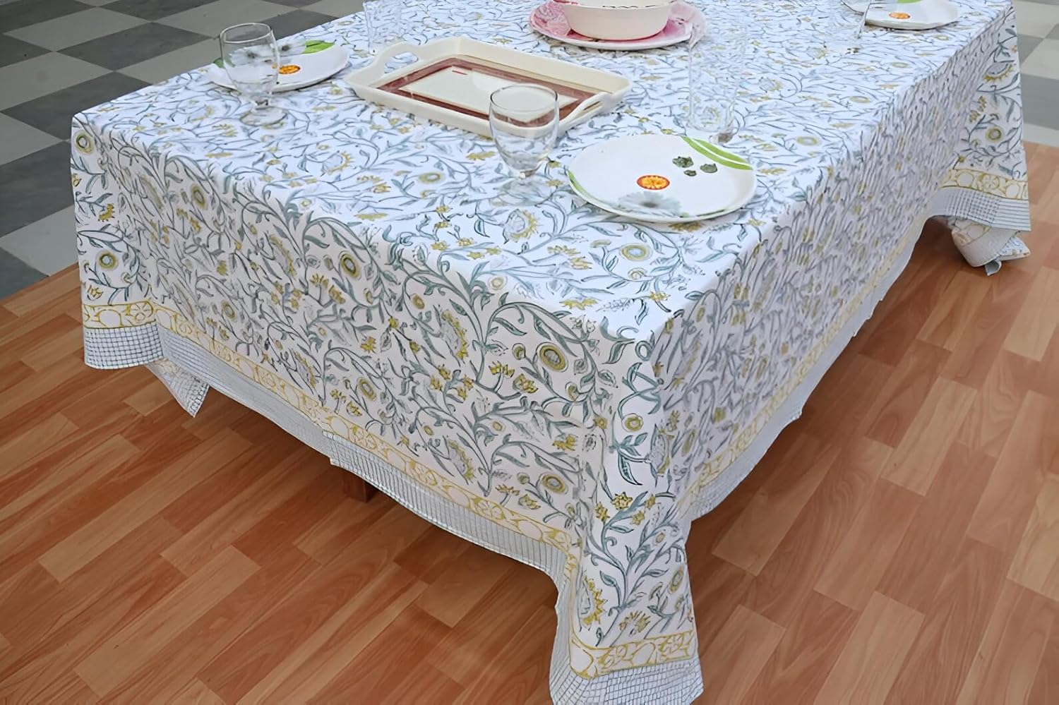 A Beautiful gorgeous tablecloth made of 100% cotton fabric is a must-have to enhance the decor and ambiance of your dining table or side table. It features a beautiful Indian floral block print design in different colors and shades against a nice background with a unique border pattern. This 100% cotton tablecloth is perfect and essential for your dining decor. Fabric Type:- 100% Pure Cotton Print:- Hand Block Print Size:- 60 X 90 inches (150 X 225 cm) Approx