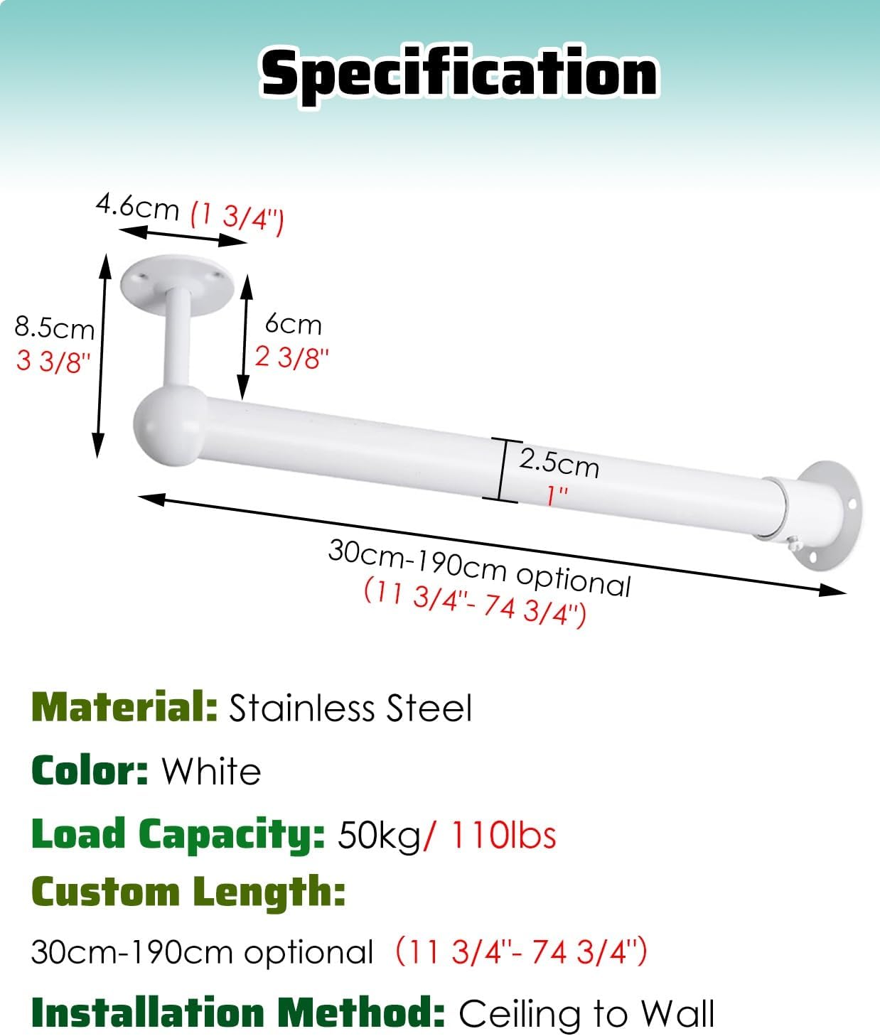 Closet Rod Top Mount Wardrobe Bars:Introducing our Closet Rods, the perfect solution for organizing your wardrobe while adding a sleek touch to your space. Designed for those who appreciate both functionality and style, our rods enhance your storage capabilities effortlessly. **Package Includes** 1 x Closet Rod **Specifications** Material: Durable Stainless Steel Color Options: Black, White Length: Adjustable from 30cm to 190cm (11 3/4" to 74 3/4") Maximum Load Capacity: 50kg (110lbs) Installation: Ceiling to Wall Mounting Method: Screw Mounting Cuttable for Custom Lengths Customizable to Fit Your Space **Key Features** Elegant and robust design that complements any decor. Complete with all necessary brackets and screws for easy installation. Rust-resistant material ensures your clothes stay stain-free. Ideal for hanging heavier garments like winter coats and suits. Simple assembly process makes it user-friendly. Sturdy construction prevents bending under the weight of your clothing. Easily cut to desired length with a hacksaw for a perfect fit. Keeps your wardrobe organized and tidy, maximizing your available space. Whether you're working with a small closet or a spacious dressing room, our versatile rod adapts to your needs, making it a valuable addition to your home storage solutions. **Please Note** Minor measurement variations of 1-2 cm may occur due to manual measuring techniques. While we strive for accurate color representation, lighting and display settings may cause slight color differences. **After-Sales Support** Committed to providing the best quality and service, we are here for you. For any inquiries regarding our products or orders, please reach out via email, and our team will respond within 24 hours, ensuring your satisfaction.