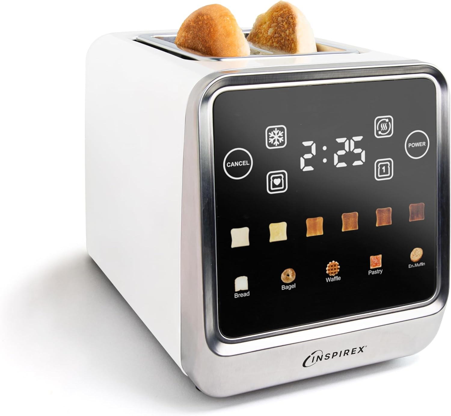 With the Inspirex Touchscreen Toaster, perfection is at your fingertips. Toast your favorite type of bread, bagel, English muffin, or pastry, perfectly crispy on the outside while keeping the inside moist and delicious. On the quick response touchscreen display, you can choose from 8 bread types and 7 browning levels, each with its own toasting algorithm to reach the precise toasting level you desire. The pre-programmed times are tested and ensured to reach the exact browning level selected. Add time, defrost, and reheat settings are also available for you to make further adjustments to your toast. The sleek, modern design makes it a staple for any kitchen and will inspire you to make excellent recipes!