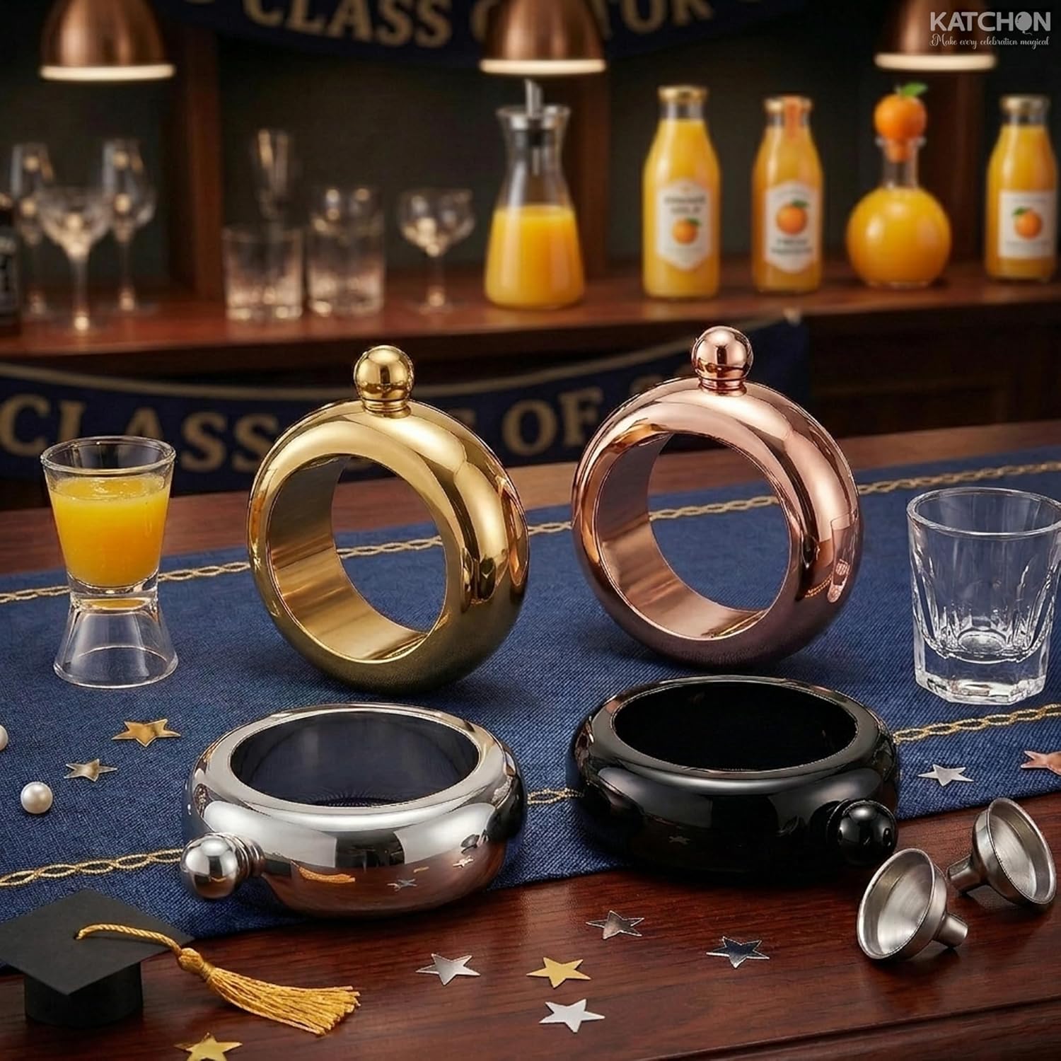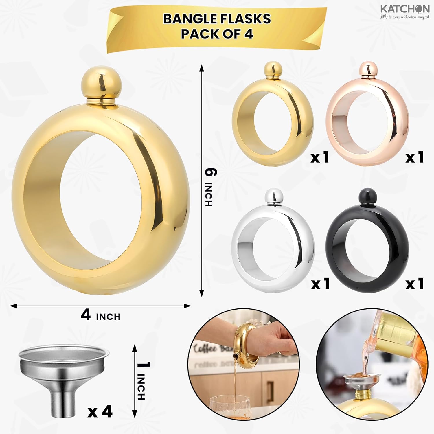 Celebrate Every Occasion in Style!The KatchOn Bangle Flask Set is a chic and versatile bracelet-style accessory designed for all your favorite celebrations — from graduations and bachelorette parties to birthdays, holiday gatherings, and outdoor festivals. These fashion-forward flasks blend elegance with everyday practicality, letting you carry your favorite beverages discreetly and in style. With four metallic finishes — gold, rose gold, silver, and black — there is a bangle for every outfit and every season.Crafted from premium stainless steel, these bangle flasks are built to last and easy to clean, making them an ideal reusable accessory for year-round use. Whether you are heading to a summer beach party, a cozy fall tailgate, a sparkling New Year's Eve bash, or a spring bridal shower, this set brings a fun and fashionable touch to every event. PRODUCT SPECIFICATIONSMaterial: Food-grade 304 stainless steelCapacity: 3.5 oz / 100 ml per flaskDimensions: 10 cm x 10 cm x 3.4 cm (approx. 4" x 4" x 1.3")Inner diameter: 7 cm (fits most wrist sizes)Finish options included: Gold, Rose Gold, Silver, Black WHAT YOU WILL GET4 stainless steel bangle bracelet flasks (1 gold, 1 rose gold, 1 silver, 1 black)4 mini stainless steel funnels for easy, mess-free fillingSecure screw-top ball cap closure — leak-resistant designReusable, BPA-free, and easy to clean PERFECT FOR EVERY SEASON AND CELEBRATIONSpring: Bridal showers, bachelorette parties, graduation parties 2026, outdoor picnics, Easter celebrationsSummer: Beach parties, pool parties, 4th of July gatherings, music festivals, outdoor concertsFall: Tailgate parties, Halloween costume accessories, Thanksgiving friendsgivings, harvest festivalsWinter: Holiday office parties, Christmas gift sets, New Year's Eve celebrations, ski trip accessories SUGGESTED USESBachelorette party supplies and favorsGraduation party accessories and gifts 2026Birthday party favors for herBridesmaid gifts and bridal shower party suppliesUnique stocking stuffers and holiday gifts for womenGirls' night out accessoriesFestival and concert accessoriesWhite elephant gifts and Secret Santa presentsStylish, functional, and endlessly giftable — the KatchOn Bangle Flask Set is the party accessory everyone will be talking about. Add it to your cart today and make every gathering unforgettable.