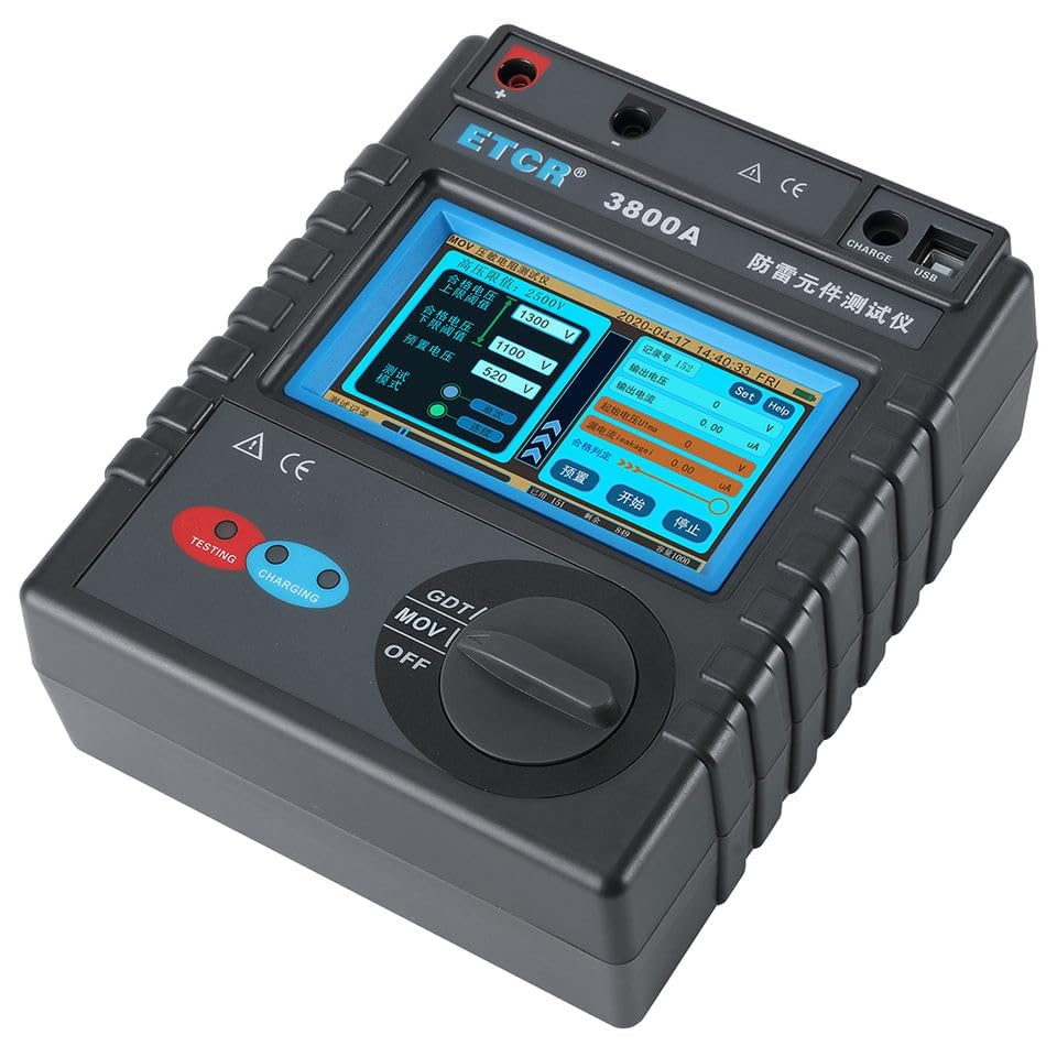 QIUSUO Lightning Protection Component Insulation Resistance Tester Arrester Insulated Device with MOV Range 0~2000V 0~1000μA Resolution 1V/0.1uA Technical Parameters Measure Function: MOV: Output Voltage: Initial action voltage U (1mA); Measure Range: 50~3000V;Accuracy:±2%rdg±3dgt ;Resolution:1V;Test Condition: 1mA±5μA Leakage Current: I(0.75U, 1mA);Measure Range:0 ~ 1000μA;Accuracy:±2%rdg±10dgt;Resolution: 0.1uA;Test Condition: 0.75U1mA≤±1% ±1d Output Voltage: Measure Range: Resolution: Test Condition GDT: Output Voltage:DC breakdown voltage Vsdc; Measure Range:50~ 3000V; Accuracy: ±2%rdg±3dgt; Resolution:1V;Test Condition: 100V/S±10% Power Supply:DC 7.2V 2600mAH rechargeable lithium battery(continues working above 3 hours) Test mode:DC power drop method Shift:Automatically Display Mode:Touch color LCD, LCD size: 108mmx65mm Host Dimension:215mmx 178mmx83mm Weight:2.09kg(include accessories) Test Wire:Red wire 1M, black wire 1M Boost Speed Setting:5 boost level in total High Voltage Threshold ValueSetting:Adjusting with step “250V”, the maximum can be set to 3000V Qualified Range Setting:Yes Qualified Judgment Function:Buzzer indication, qualified ring once, unqualified three rings Overvoltage Protection:Yes Data Storage:MOV 1000 groups; GDT 1000 groups; Insulation resistance: 1000 groups, storage space used and remaining capacity indication Data Upload:USB interface, storage test record can be uploaded to computer Battery Voltage:Battery charge indication, low battery voltage remind to replace the battery Auto Shut down:25 minutes after boot up, the meter shuts down automatically without any operation Accessories:Host: 1PCS; Test wires: 2PCS; Alligator clip: 2PCS; Probe: 2PCS; Charger: 1PCS; USB communication cable: 1PCS; Meter bag: 1PCS