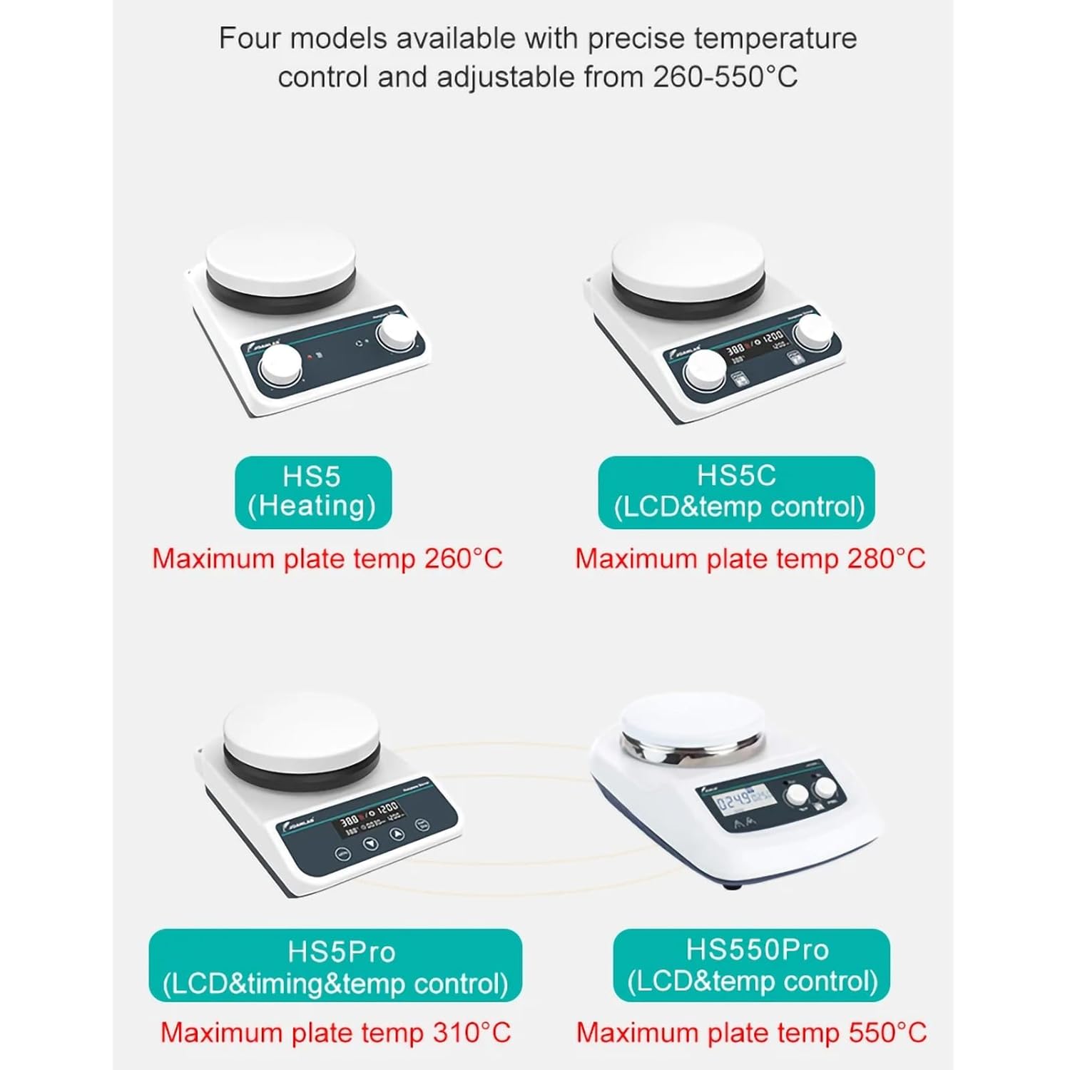 The heating process is rapid and takes very little time. The stirring power is quite good, and the maximum speed of 1500 rpm is quite strong.Product Model: HS5Speed Range: 200-1500rpmSpeed Increment: NoneMaximum Stirring Volume: 2LMaximum Working Plate Temperature: 260℃Working Plate: φ135mm Ceramic Coated PlateMotor Type: Brushless MotorTiming Range: NoneControl Method: KnobLiquid/Plate Temperature Control Accuracy: NoneTemperature Sensor: NoneRated Power: 200WProduct Dimensions: 225*155*90mmProduct Model: HS5ProSpeed Range: 50-1500rpmSpeed Increment: 10rpmMaximum Stirring Volume: 2LMaximum Working Plate Temperature: 310℃Working Plate: φ135mm Ceramic Coated PlateMotor Type: Brushless MotorTiming Range: 1min-12hControl Method: Button & Digital DisplayLiquid/Plate Temperature Control Accuracy: ±1℃ / ±3℃Temperature Sensor: PT1000/External PT1000Rated Power: 400WProduct Dimensions: 225*155*90mm