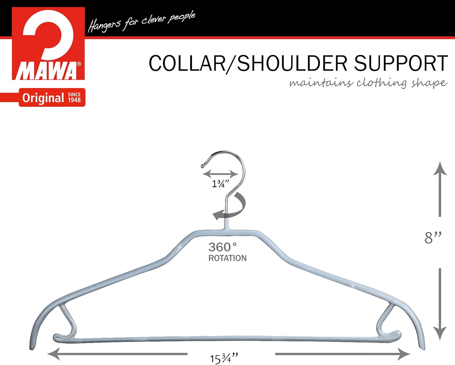 MAWA is the most unique, high end quality hanger on the marketplace. Don't be fooled by Chinese copies of the Original MAWA hanger. MAWA hangers are made in Germany with the use of the finest quality materials and dedication to safe environmental manufacturing practices. This steel hanger is a long-lasting clothing hanger that your clothing deserves. MAWA hangers are unlike anything on the market because they are made to fit YOUR clothing needs and sizes. The hanger market hasn’t offered customers many choices. Typically, you are offered a standard hanger or a hanger with a pant bar, that’s it. How is that supposed to apply to all the different shapes of clothing on the market? The answer is, it’s can’t. MAWA Hangers offers narrow, standard, and wide hanger options. We offer hangers that support shirt collars/polo’s, promises sweaters won’t get shoulder lumps, and suites maintain their shape. Choose the hanger collection that works for each style of clothing in your closet. Choose from Silhouette, Euro, Body Form, Pant/Clips, & accessory Collections. Each hanger from the different lines all will hang from the clothing bar evenly to give you a clean professional closet appearance. Each hanger is made of carton steel that is long lasting, durable, and hold up to 8 lbs. They are coated with a skin safe PVC material that is sure to grip. Unlike felt covered hangers you can dry your wet clothing on our hangers without losing their grip. No matter how many cloths you have in your closet your clothing will stay on the hangers. So, you will never have odd articles of clothing on the bottom of your closet again. MAWA has created the highest quality coating to protect your clothing and skin. Each hanger is free of phthalate, formaldehyde, azo dyes, lead, mercury, cadmium and so much more. Our formula is as well because it’s manufactured from strictly ecological perspectives. So, what are you waiting for, give MAWA a try and give your clothing a hanger that will last and give you the benefits and features you deserve. Proudly women-owned and operated!