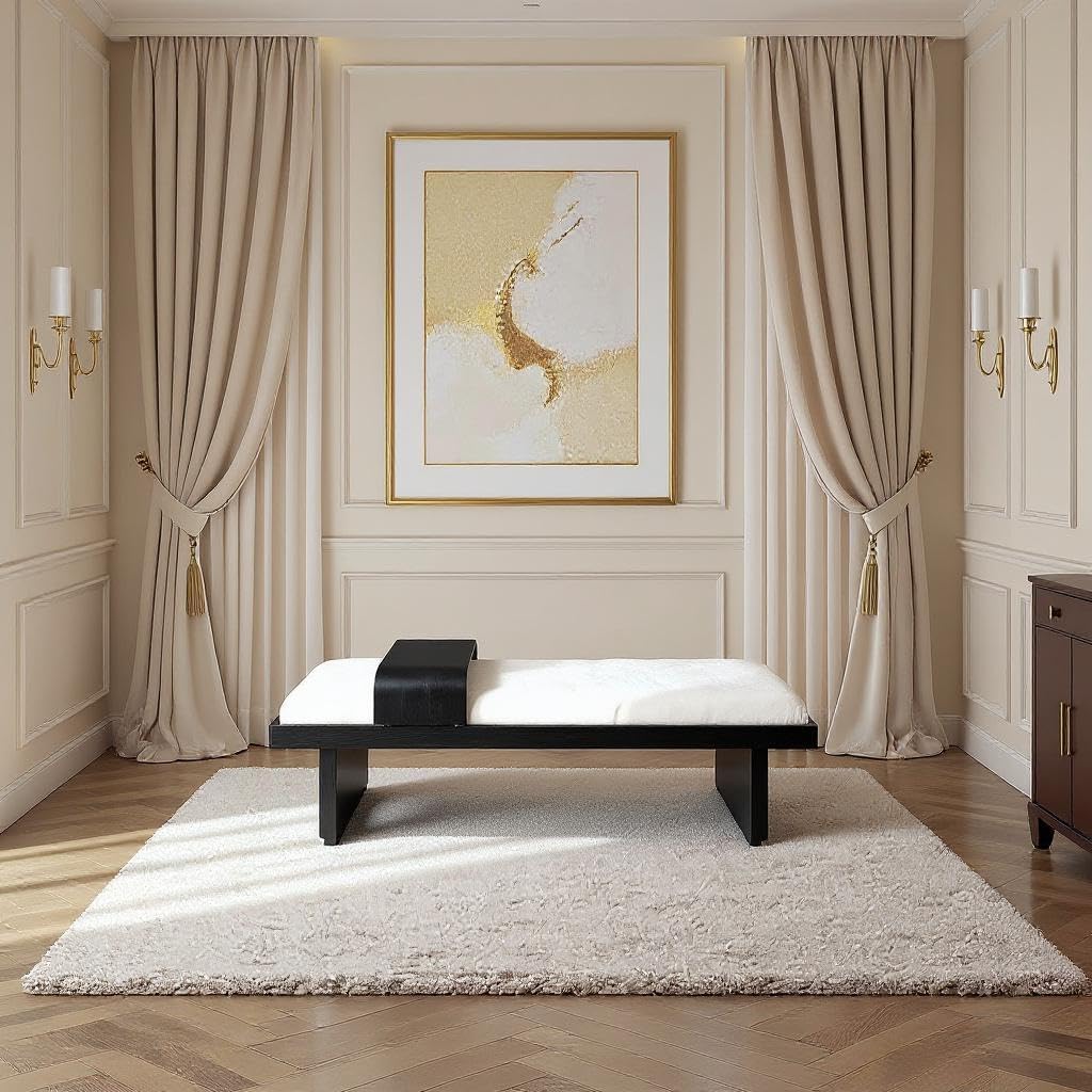 | Item Type Name | Mid-Century Modern Bench with Soft Chenille Fabric, Rich Finish, Solid Wood, Sliding Wooden Tray |