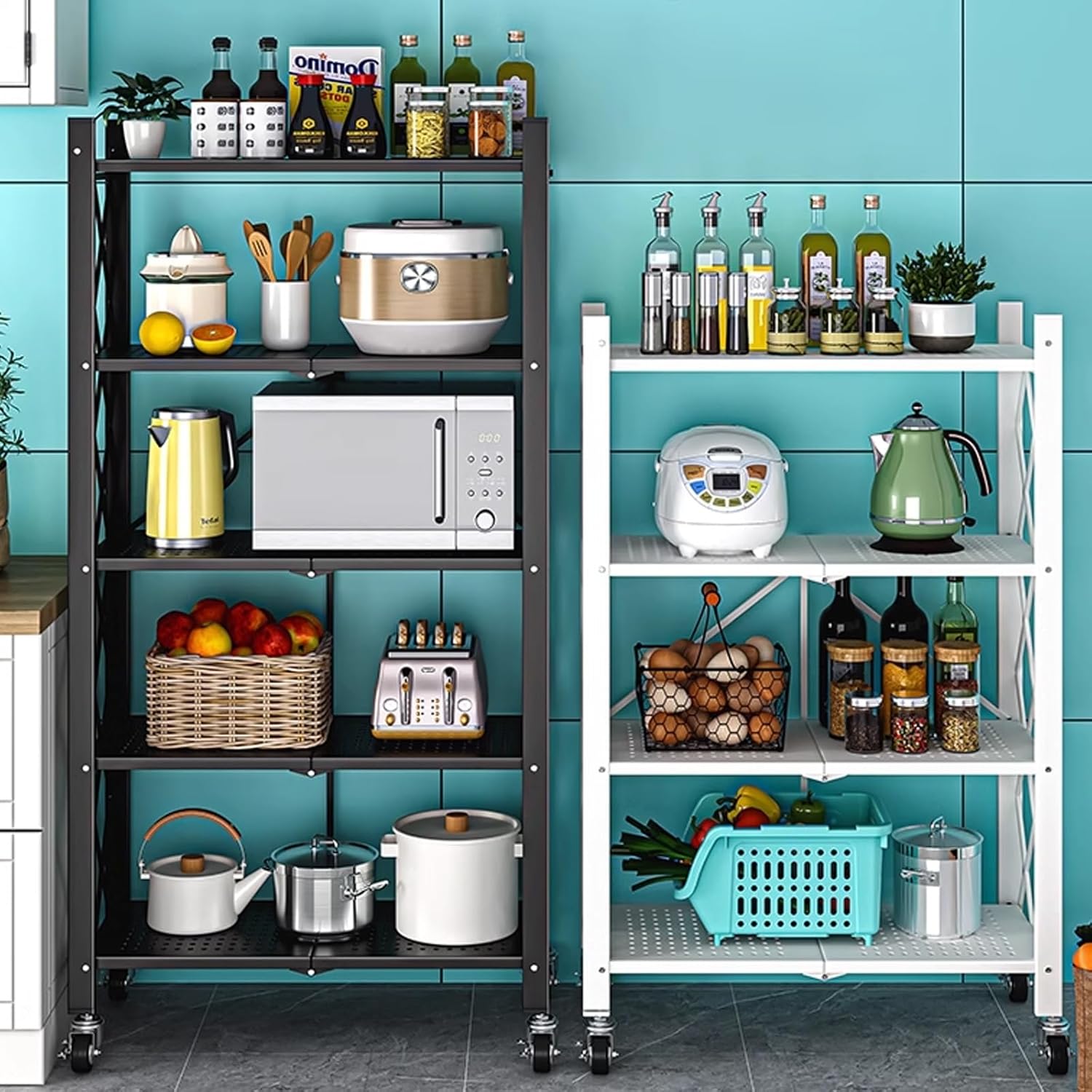kitchen storage rack:Storage Rack for Home, Office, Garage, Basement, GYM, Bathroom & Laundry Room This kitchen cabinet is the perfect companion for creating a neat and clean kitchen. Strong and Sturdy - High quality materials, good durability. Waterproof surface, easy to clean and maintain. Ample Storage Space - 3/4 level storage space for small accessories, cutlery, dry goods, microwave and toaster. Smooth Edge - The corners of the top of the buffet sideboard are smoothed to reduce the damage to the skin caused by the collision. Easy Mobility - 360° swivel casters make movement flexible and easy. You can turn the kitchen bakers rack any directions effortlessly. Multifunctional - It can be put in your living room, kitchen, corridor and any other place to keep your bottles, drinks, plates, fruits, books, coffee machine and decors. Specification Color: White, Black Material: Carbon steel Number of Shelves: 3/4 Assembly Required: No Overall Size(W)*(D)*(H): 3 tier: 71*36*85 cm/ 28*14*33 in 4 tier: 71*36*125 cm/ 28*14*49 in Package Includes: 1 x Kitchen shelf 4 x Universal wheel