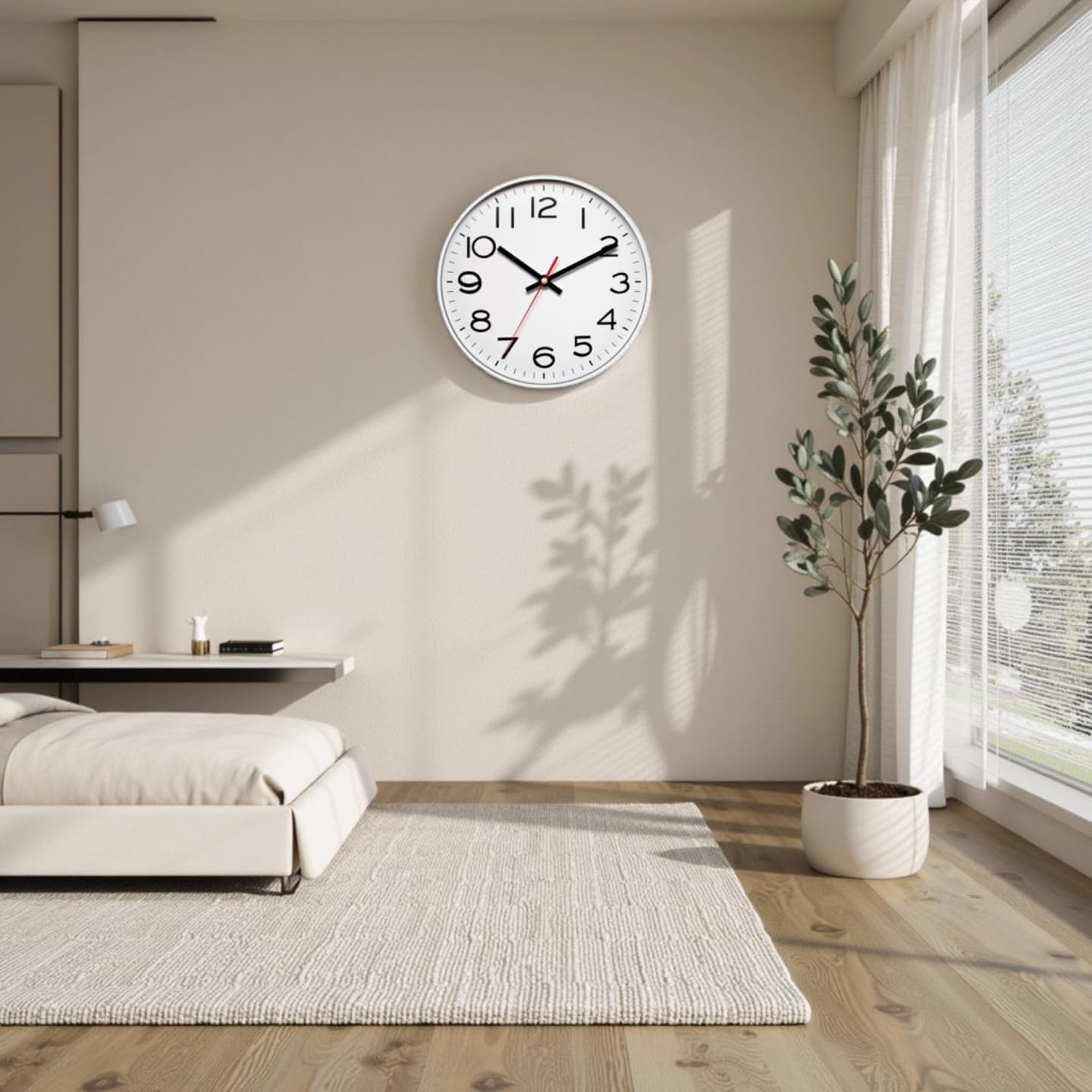 This wall clock features a classic round shape with a diameter of 16 inches (40 cm). It comes with a silver frame, a white dial, large black bold numbers and a red second hand, ensuring easy readability at a glance. Equipped with precise quartz movements, it guarantees accurate timekeeping at all times. Designed in a modern and elegant style, this clock serves as a perfect decorative piece suitable for various occasions including homes, offices, libraries, kitchens, classrooms and hospitals. What’s more, it is easy to hang and operates with one AA battery (not included).