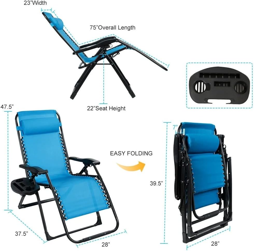 It for the home office, bedroom, study room, living room, classroom, school, computer desk, apartment, guest workstation, gaming room or conference room.Features.No painting or staining required, low maintenance, water clean surface for easy cleaningSave your outdoor space, folding design for easy storage, keep your drinks handy in the built-in cup holderBackrest and seat to perfectly fit the curves of your bodyWide armrests to comfortably support your arms for patios, porches, backyards and poolside designsSpecifications.Colour: Material: steel, fabricExtended size: (37.5-73.5") x 27.5" x (34"-47.5") (L x W x H)Folded size: 39.5" x 28" x 7" (L x W x H)Cup holder size: 15.5" x 9.5" x 2.5" (L x W x H)Pillow width: 17.5"Weight capacity: 500 lbsNet weight: 20.5 lbsPackage Includes1 x Zero Chair1 x cup holder1 x headrest pillow1 x user guide
