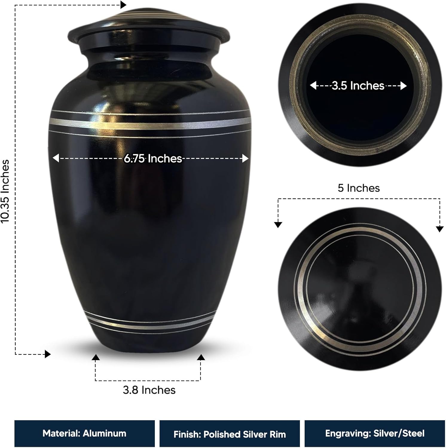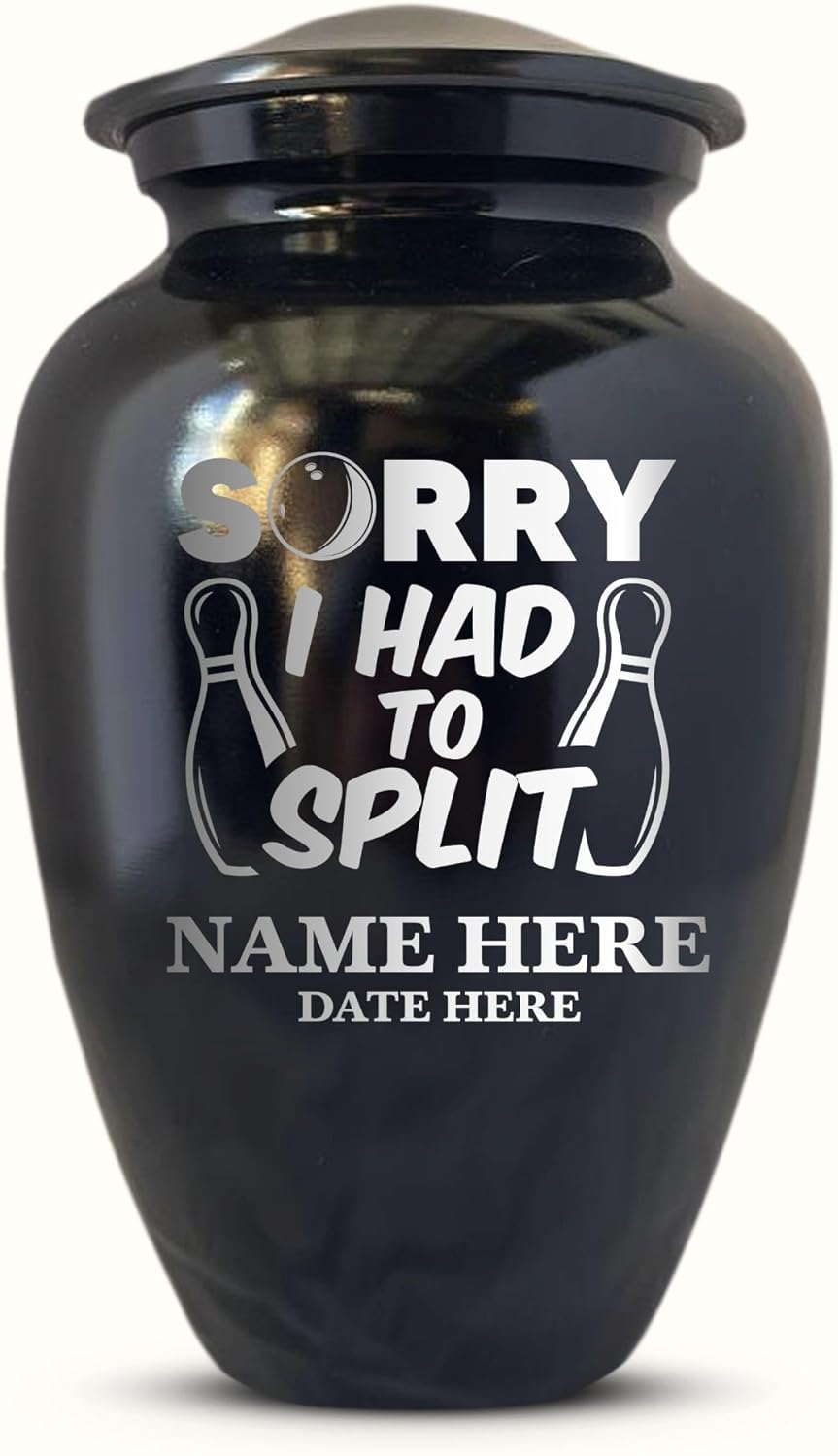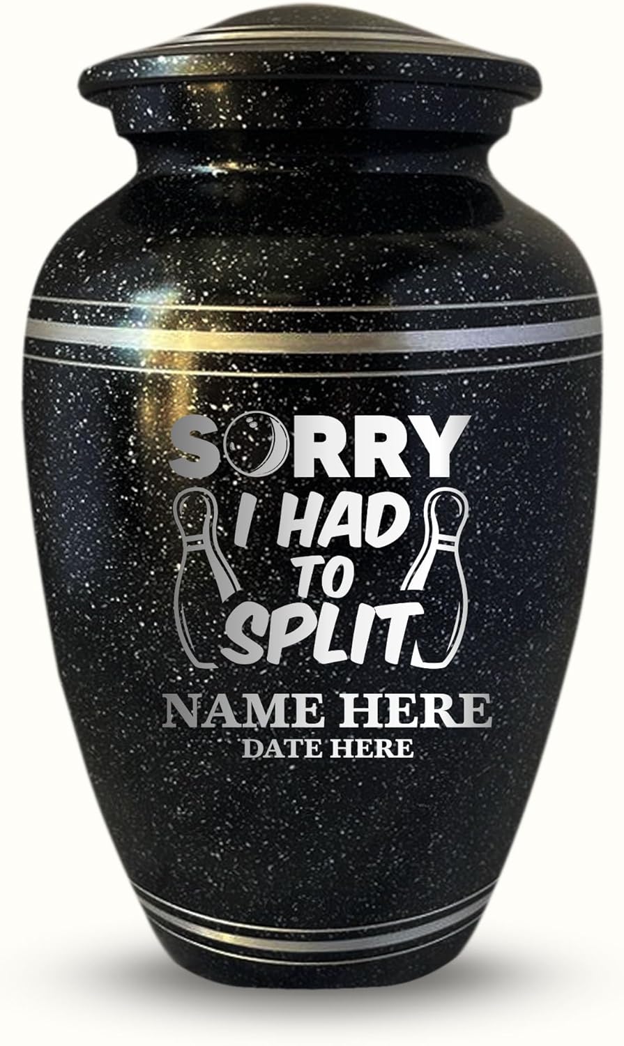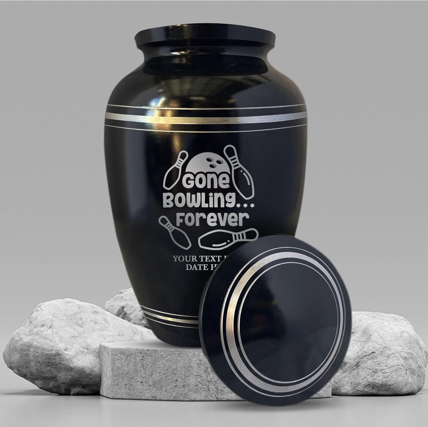 This collection is not for everyone but was inspired by a very special person before she passed on; we miss you, Grandma Sue. Introducing our Personalized Custom Human Cremation Urn with a Polished Silver Rim, a poignant tribute crafted for bowling enthusiasts. Handmade in India, this urn pays homage to those who cherished the lanes and the camaraderie of the sport. Crafted with care, this urn features a polished silver rim, boasting a lid diameter of 4.5 inches and a stable 3.75-inch bottom. Its 3.25-inch opening ensures easy placement of ashes. With a threaded lid closure and a felt-lined bottom, it ensures both security and a touch of elegance. Coated with moisture prevention paint inside, it preserves the ashes, albeit with an initial scent. Tailored for both men and women, this personalized human aluminum cremation urn accommodates remains of up to 200 lbs. It bears the name of your loved one and showcases a whimsical ""BOWLING"" design, reflecting their passion for bowling. Whether they relished competitive tournaments or cherished casual games with friends, this urn encapsulates their love for the sport. The silver-colored engraving adds a poignant touch against the urn's surface, creating a lasting tribute to their bowling adventures. More than a mere vessel, this urn is a heartfelt homage to the strikes, spares, and cherished memories shared on the lanes