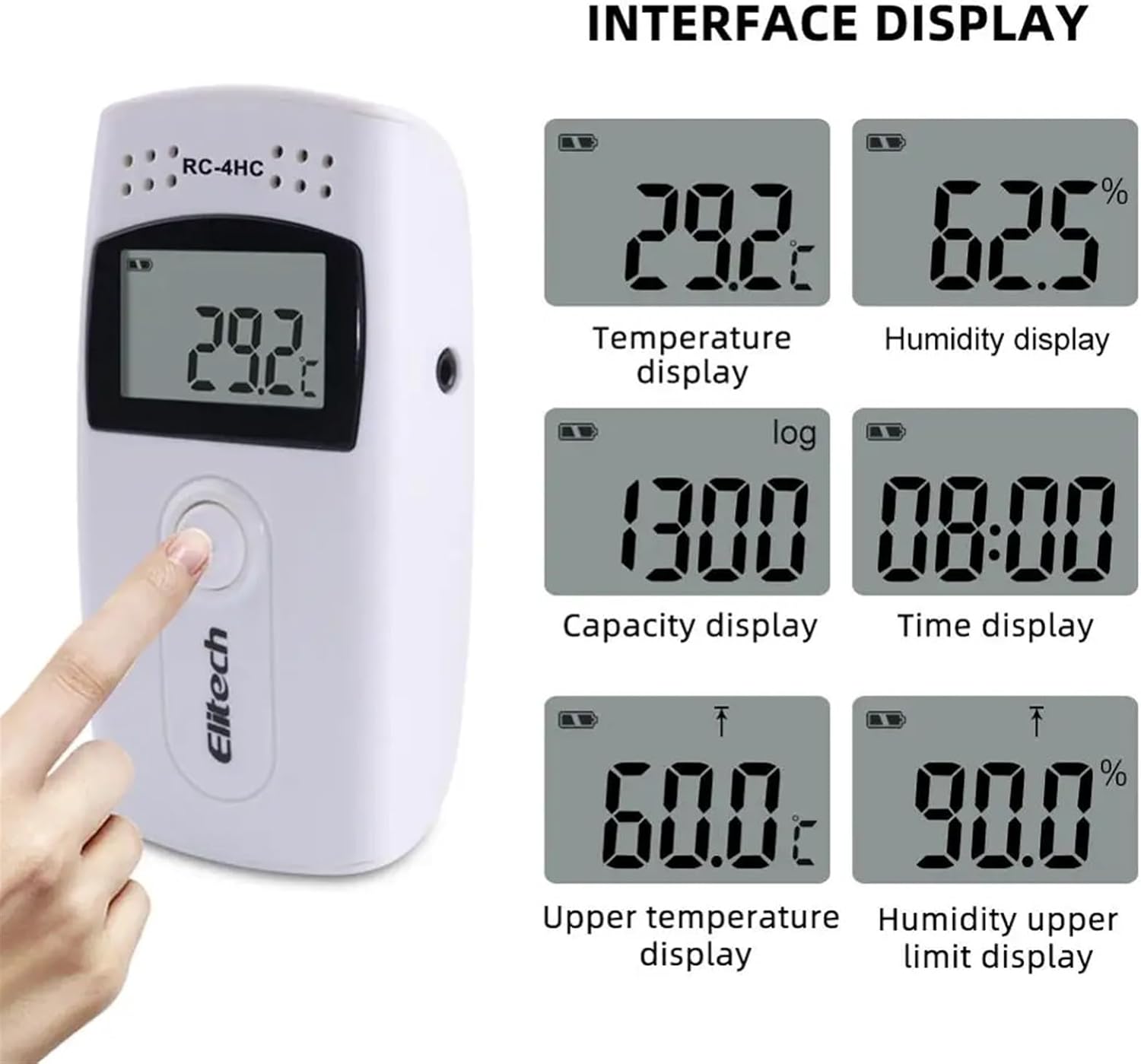 ThermostatsRC-4HC Digital USB Temperature Humidity Data Logger High Precision Temperature Recorder with Built-in NTC SensorFeature:This data logger is mainly used fortemperature and humidity recordingduring storage and transportation of foodstuff, medicine, chemicals and other products, especially widely used in all links of warehousing, logistics and cold , such as refrigerated containers, refrigerated trucks, refrigerated package, cold storage, laboratory, etc.It has a large permanent data memory of16000 pointsand comes with data management software for easy data download to computers through USB interface. With the software, you could analyze data in form of tables and graphs and export in picture format. The data could be queried, saved, printed and exported in Word/Excel/TXT format.Wide measuring range, high accuracy for Temperature and Humidity.Temperature measuring range: -30 C to +60 C; Humidity measuring range: 0 to 99%RH.Data management software & USB cable included for working with PC easilyData can be downloaded analyzed exported and printed convenientlyOver Temperature Alarm & UpperLower Limits can be setMAXMIN values availableSpecificatonTemperature measuring range: -30~+60 °C;external sensor(cable length 1.1m), -40~+85 °C;Temperature accuracy: -20~+50°C, ±0.6°C;others, ±1.0 °CHumidity measuring range: 0~99%RHHumidity accuracy: ±3%RH(25,20~90%RH),others,±5%RH;Resolution: Temperature 0.1;Humidity 0.1%RH;Record capacity: RC-4HC 16000points(MAX);Record interval: 10s~24hour adjustable;Communication interface: USB interface;2 kinds of Power supply: inner CR2450 battery or power supply via USB interfaceThe data logger display interfaces includes: temperature status display, humidity status display, record capacity display, time display, date display, Max. temperature display, Min. temperature display, Max. humidity display, Min. humidity display.Product size: 84mm (length) X 44mm (width) X 20 mm (height)Logger weight: 40g