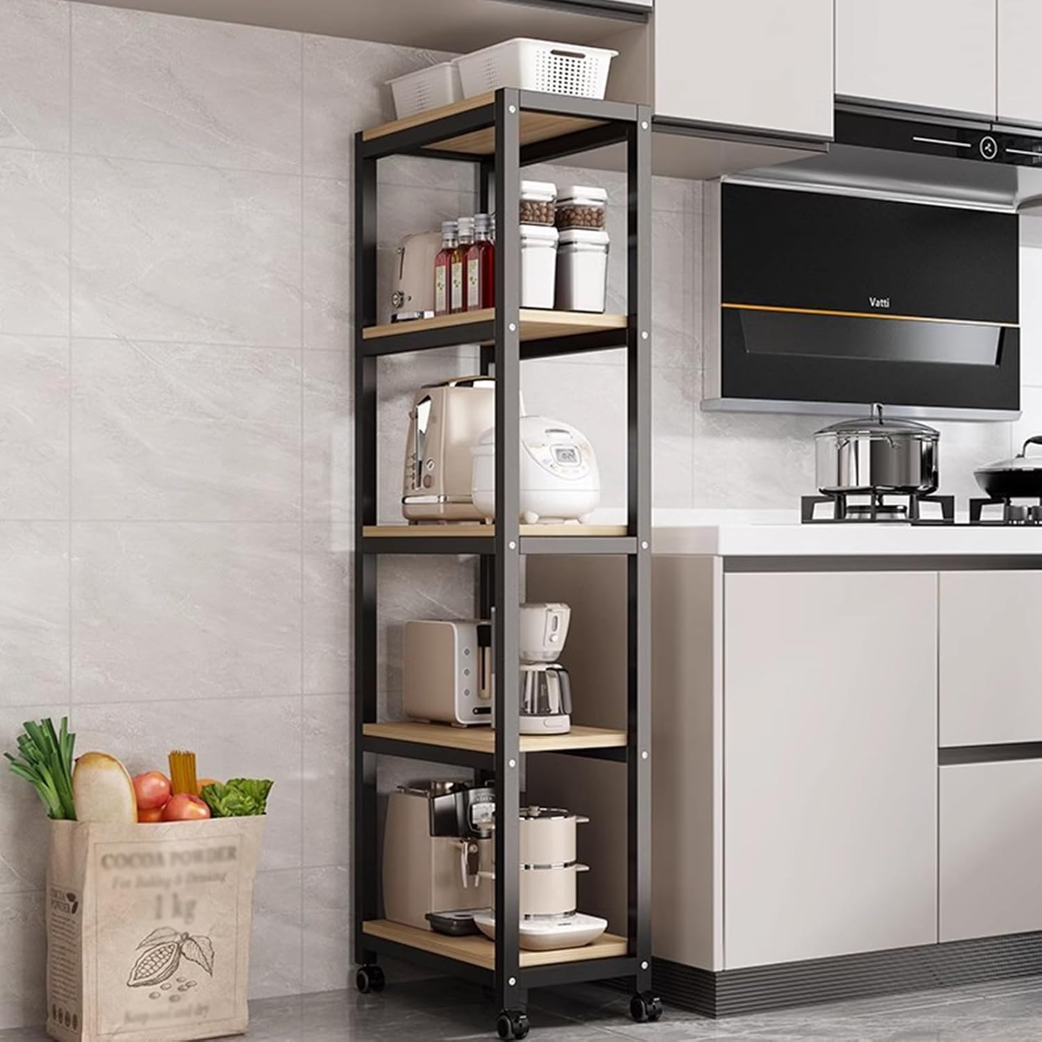Freestanding Standing Shelves Units:Product Description Slim Rolling Cart, 5-Tier Storage Cart, rolling carts with wheels, Narrow Rolling Utility Cart for Small Spaces Bathroom Dorm Room Kitchen Laundry Organizer and Storage Features: Sturdy and Durable Crafted with high-quality particleboard and a sturdy metal frame makes the storage cart long-lasting use and stability. Secure and Mobile Equipped with 4 wheels , our slim rolling cart offers stability and easy maneuverability. This slim shelf provides you with space for storing various daily necessities, so that your vegetables, fruits,books, beauty products or toiletry, cookware, cutlery, plates and other accessories are clearly visible. Specifications: Material: Carbon Steel Style: Modern With or Without Pulley: Yes Size Details: 40x20x147cm/15.7"D x 7.8"W x 57.8"H Package Included: 1*Slim Storage Cart (Other items shown in the picture are not included) Note: Due to the light and screen setting difference, the item's color may be slightly different from the pictures. Please allow slight dimension difference due to different manual measurement.