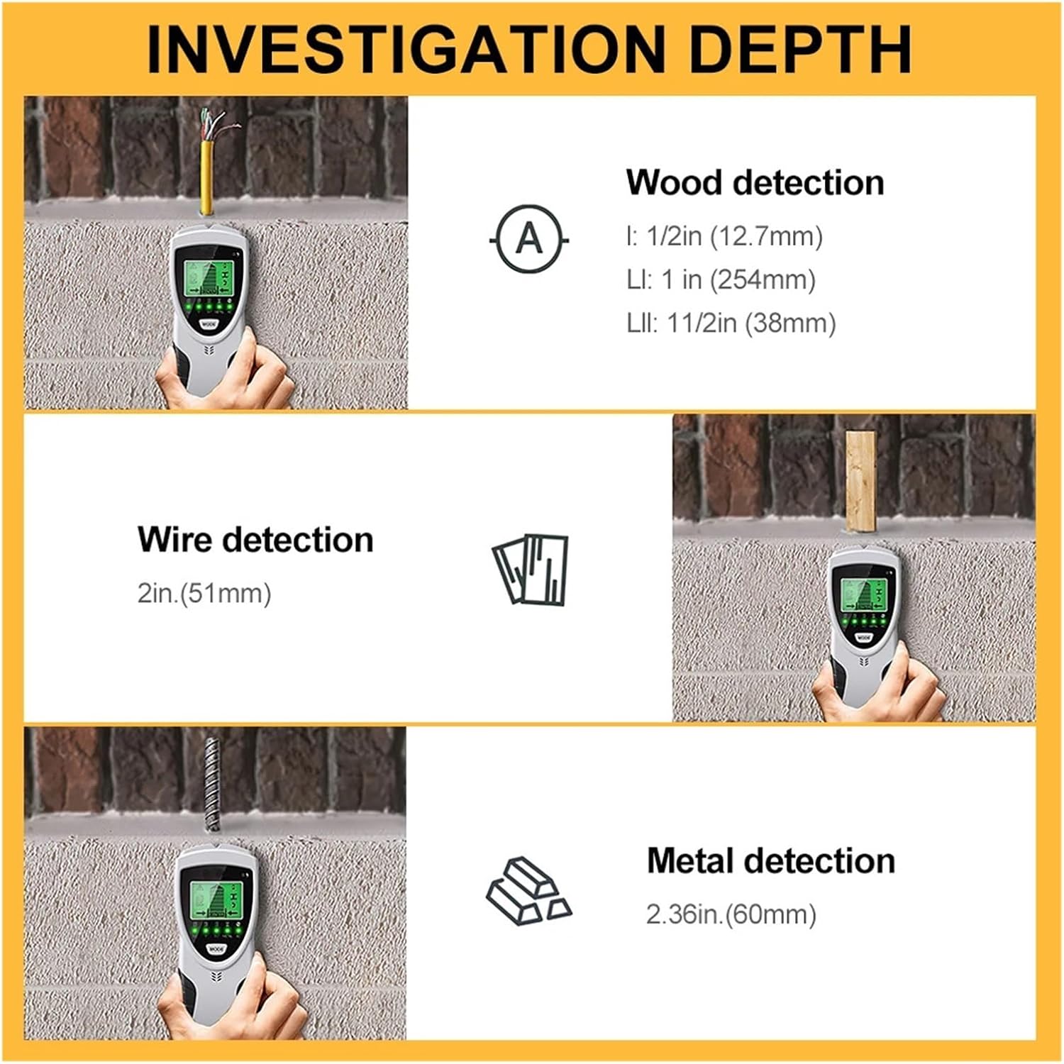 1. The wall stud finder can accurately and quickly find the edge and center of metal, studs, joists, pipes and live AC wires behind walls, floors and ceilings. Rapid detection saves users time and energy, making task completion easier.2. High visibility and comprehensive display, equipped with a bright backlit LCD display, which can show the center, edge and position of the detected studs and battery status.3. Multiple scanning modes, providing multiple scanning modes including stud scanning, depth scanning and metal scanning, allowing you to detect a variety of materials and depths.Features:Wall detector has 5 scanning modes to meet your different scanning needs, 1/2 inch (12.7mm), 1 inch (25.4mm), 1.5 inch (38mm) scanning mode for wood, 2.36 inch (60mm) scanning mode for metal, 2 inch (51mm) scanning mode for AC.The wall scanner adopts intelligent micro-sensor chip with highest sensitivity, which can accurately and quickly find edges and center of metal, studs, joists, pipes, live AC wire behind walls, floors and ceilings.Wall detector has audio alarm, which can tell you the exact location of the objects. When the wall detector approaches the edge or center of the target, it emits a beeping alarm, helping you find the object quickly.Wall detector comes with a large LCD display with backlight, which provides you with clear direction and accurate target location even in the darkness or narrow place, protecting your eyes.Specification:Product name: Wall detectorWood scan 1: 1/2 inch (12.7mm)Wood scan 2: 1 inch (25.4mm)Wood scan 3: 1.5 inch (38mm)Metal scan: 2.36 inch (60mm)AC scan: 2 inch (51mm)Display: LED LCD green backlight screenMaterial: ABS/TPESize: 180 x 80 x 35mm/7.09 x 3.15 x 1.38 inchBattery model: 1pcs 9V battery (not included)Package Listing:1x Wall detector (Battery Not included )1x Instruction Manual