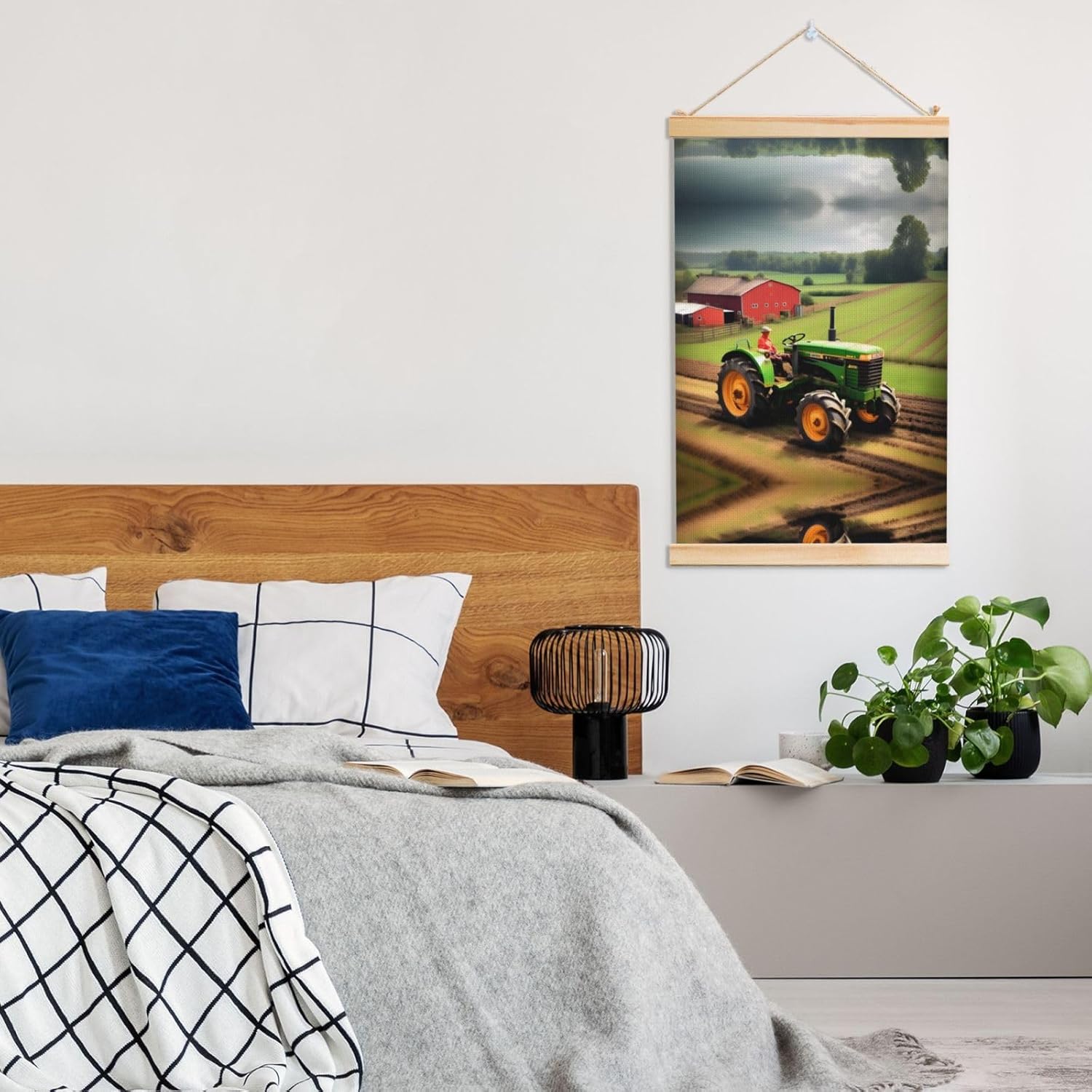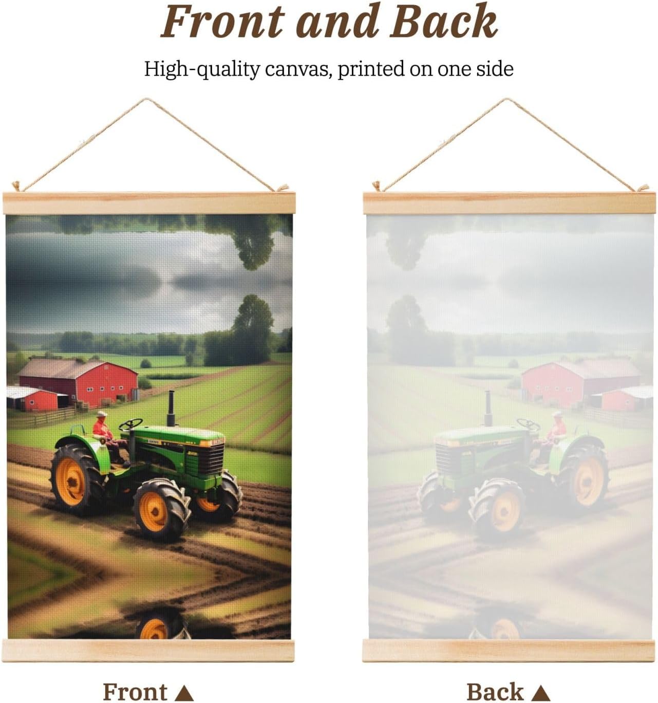 Our Tractor Farm Pattern Print Wooden Poster Hanger Is An Excellent Addition To Your Home Decor Or A Perfect Gift For Friends And Family. Made Of Selected Quality Canvas With Brilliant And Enduring Colors, This Wall Art Is Designed To Resist Water, Dust, And Fading, Ensuring The Bright And Vibrant Art Lasts. The Polyester Is Enclosed Between Two Teak Wood Hanger Scrolls With An Attached 35cm Rope For Easy Hanging. Installation Is Made Simple With The Included Two Nails In A Plastic Box. The Modern Minimalist Style Of Our Wall Hanging Complements Any Home Decor, Elevating The Artistic Ambiance And Brightening Up The Room. Experience The Elegant Transformation This Wall Hanging Scroll Painting Brings To Your Spaces Today.