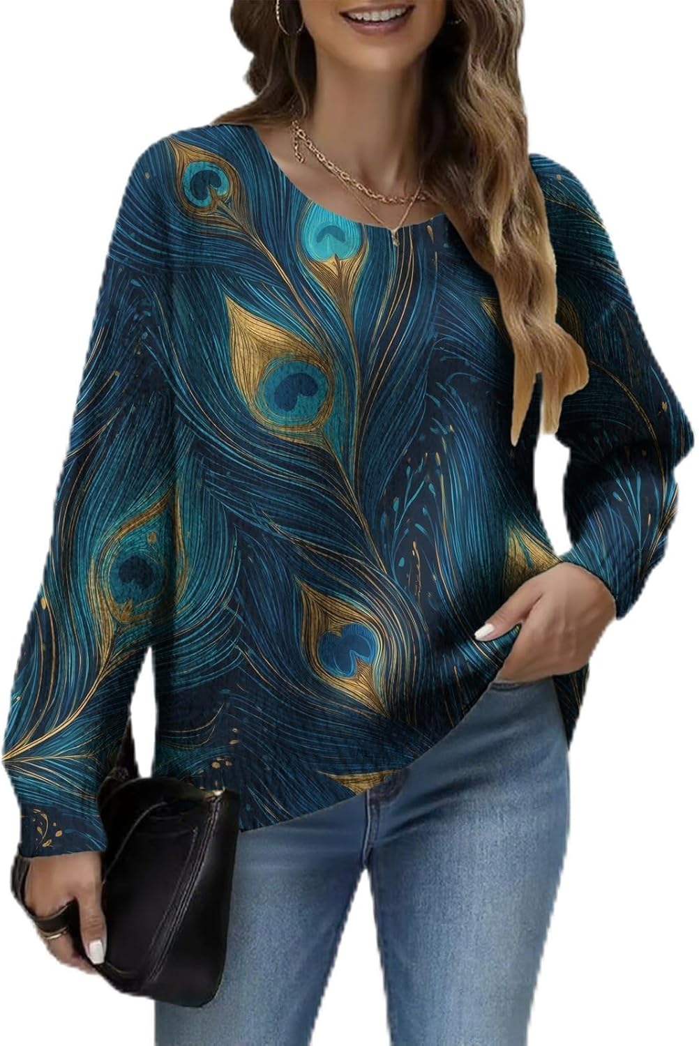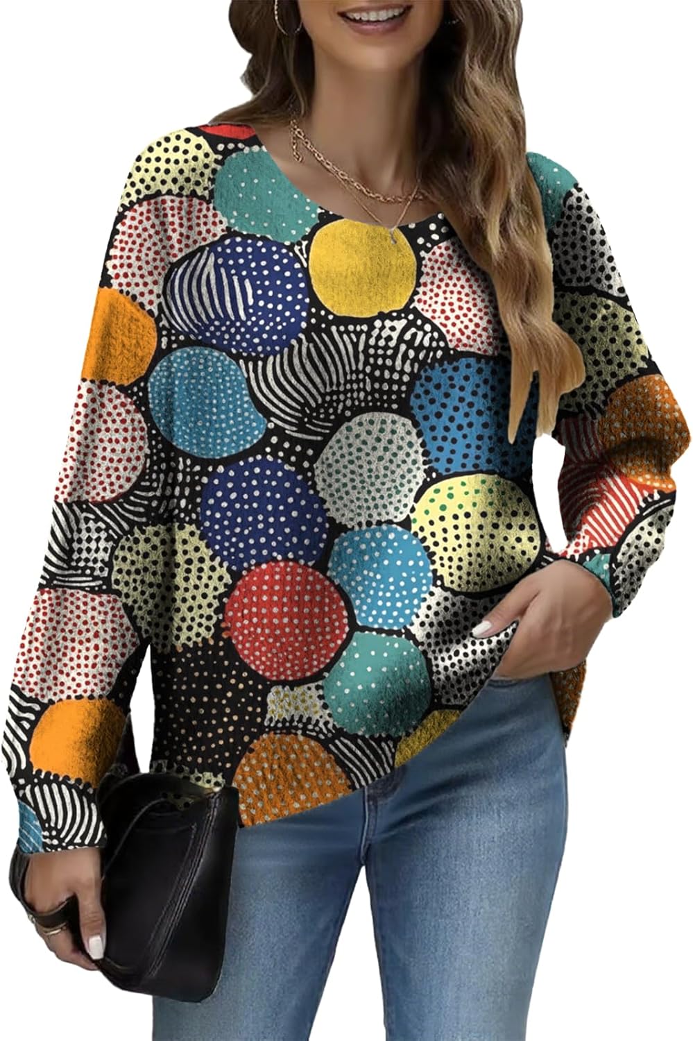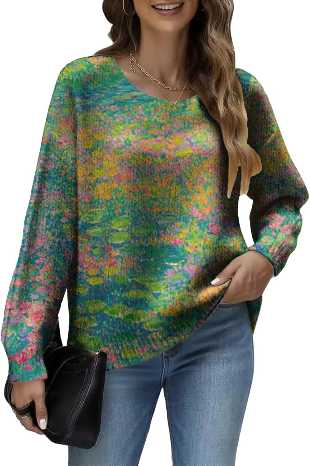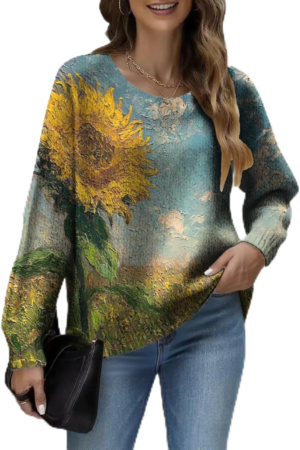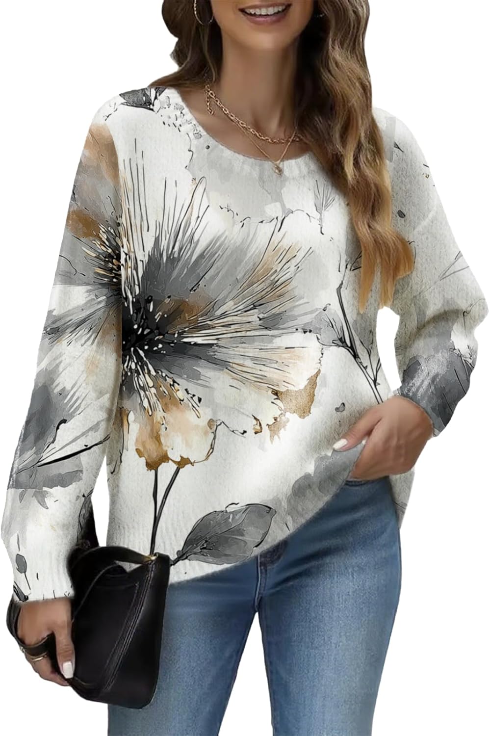 YABTF Womens Floral Print Crew Neck Sweater Long Sleeve Pull over Sweaters Womens Casual Graphic Fall Sweaters Loose Fit