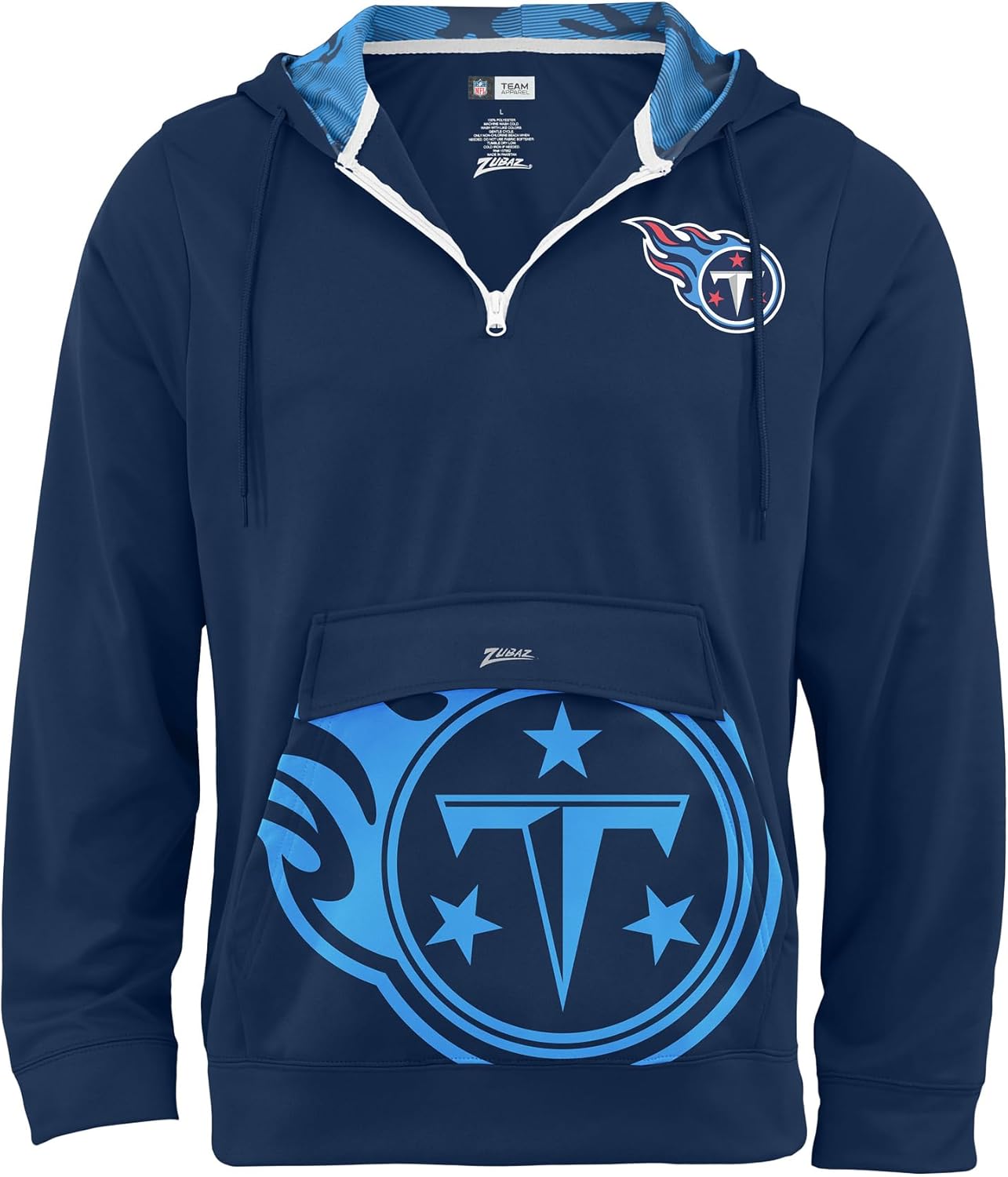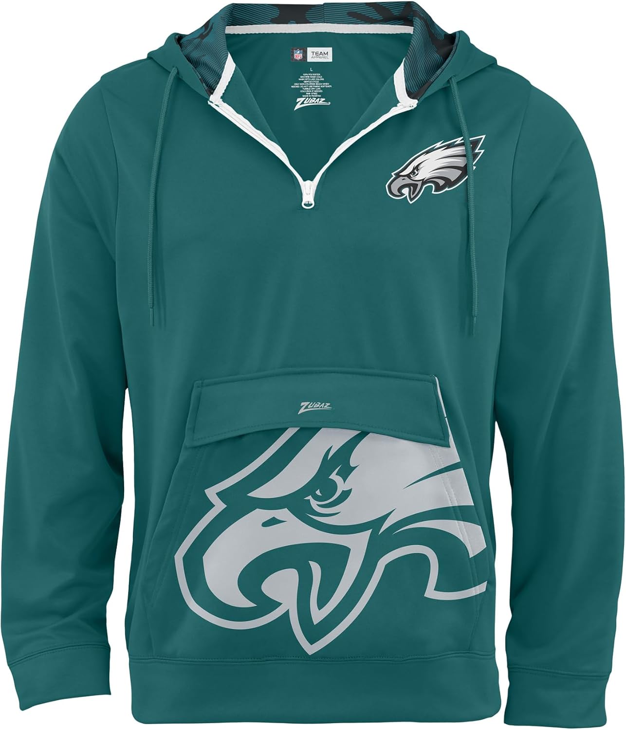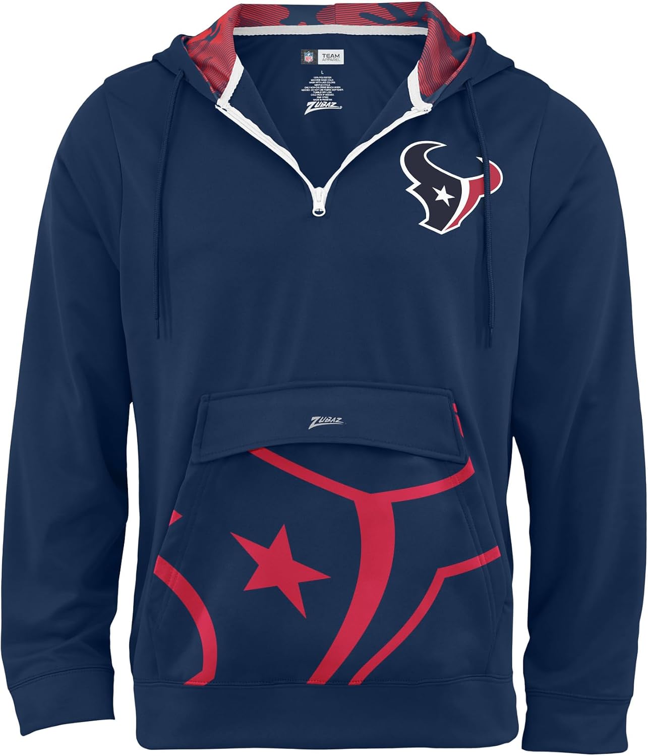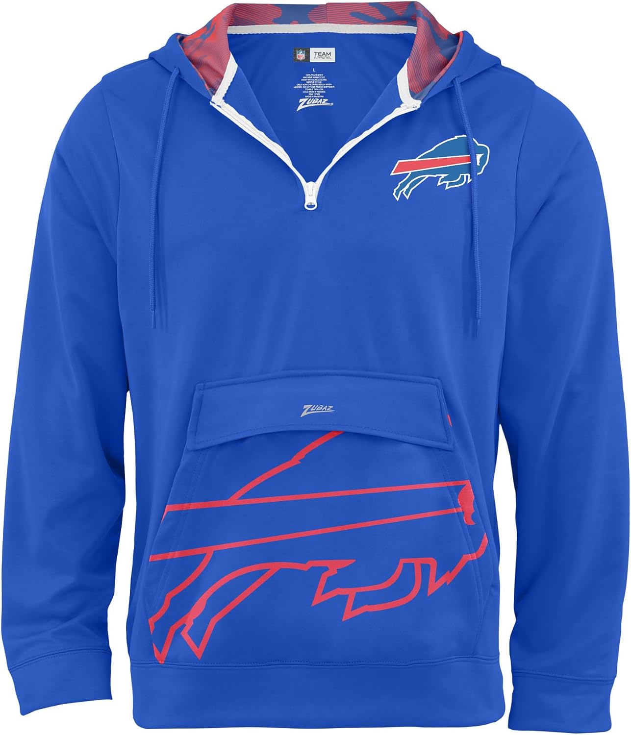 Pullover 1/4 zip hoodie, drawstring, oversized front pocket, team color, print accents, NFL team graphics